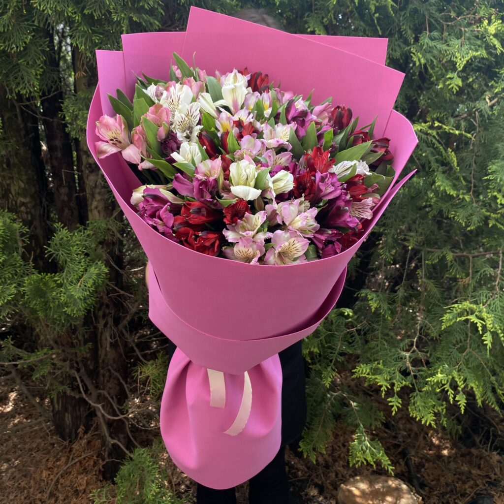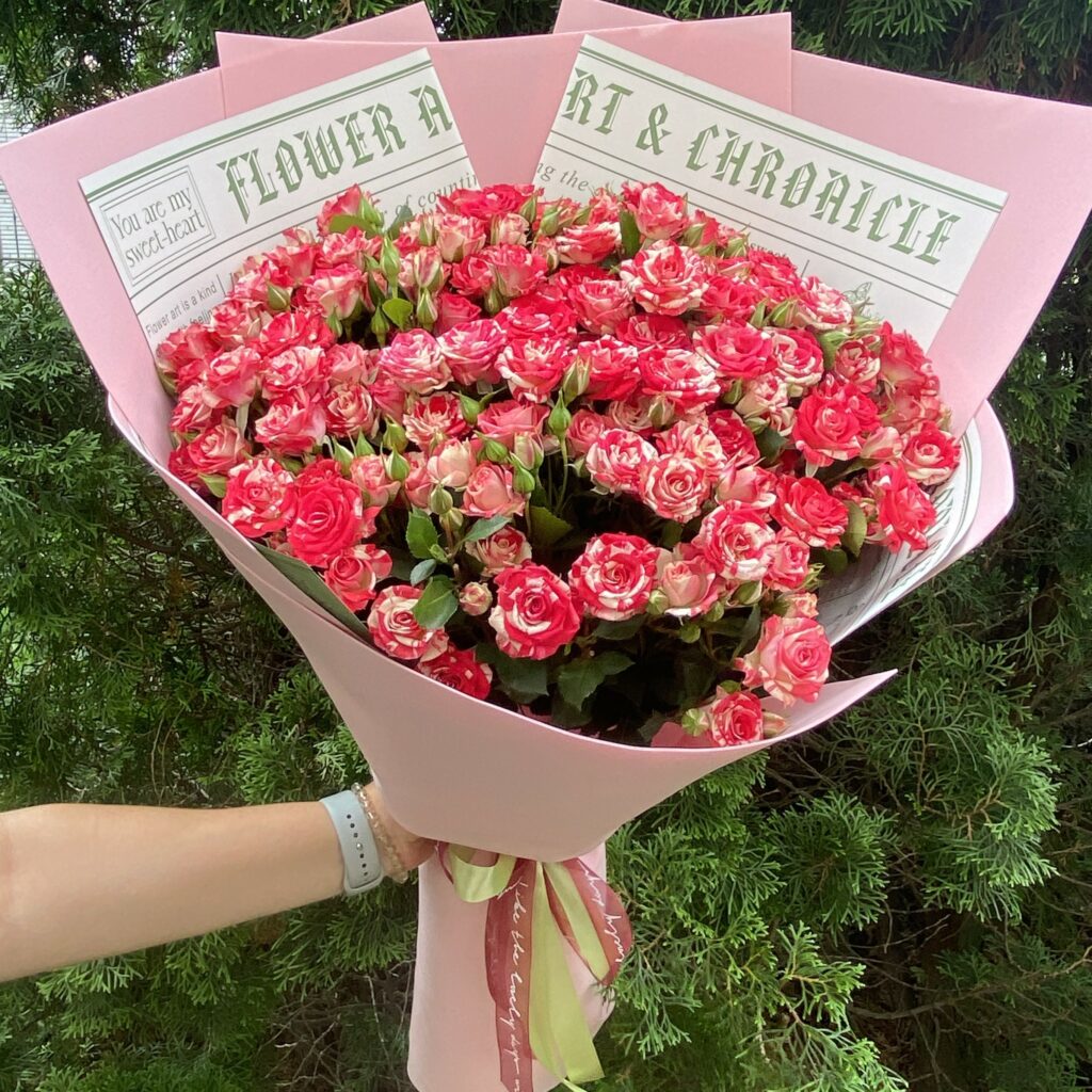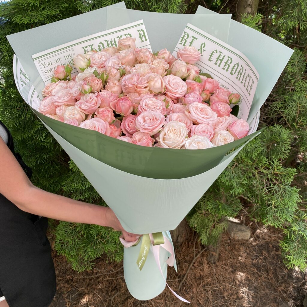 Букет-гигант — это не просто много цветов. Главный секрет — высокая монументальная упаковка из крафт-бумаги или флористической бумаги. Она создаёт объём и высоту, из-за которых букет выглядит внушительно даже при стандартном количестве цветов.