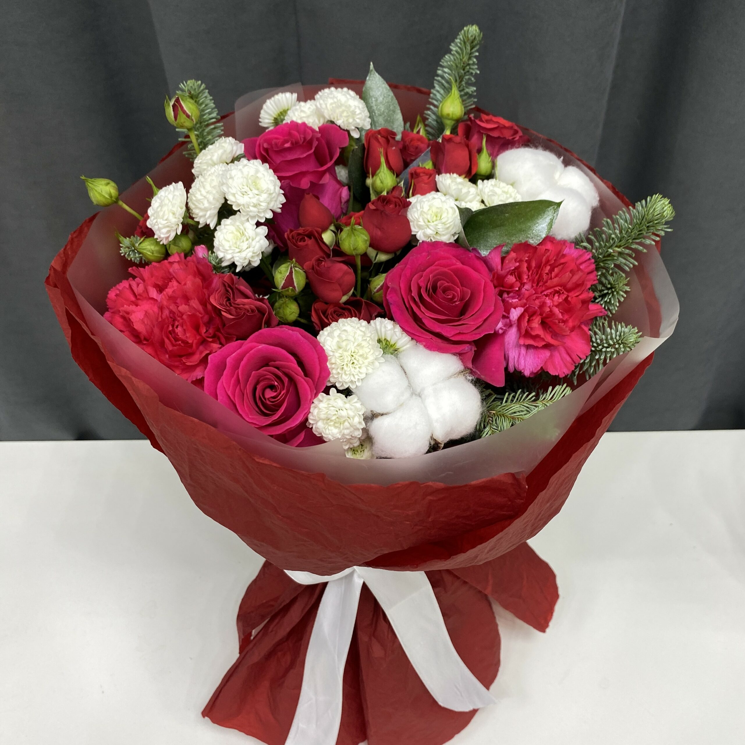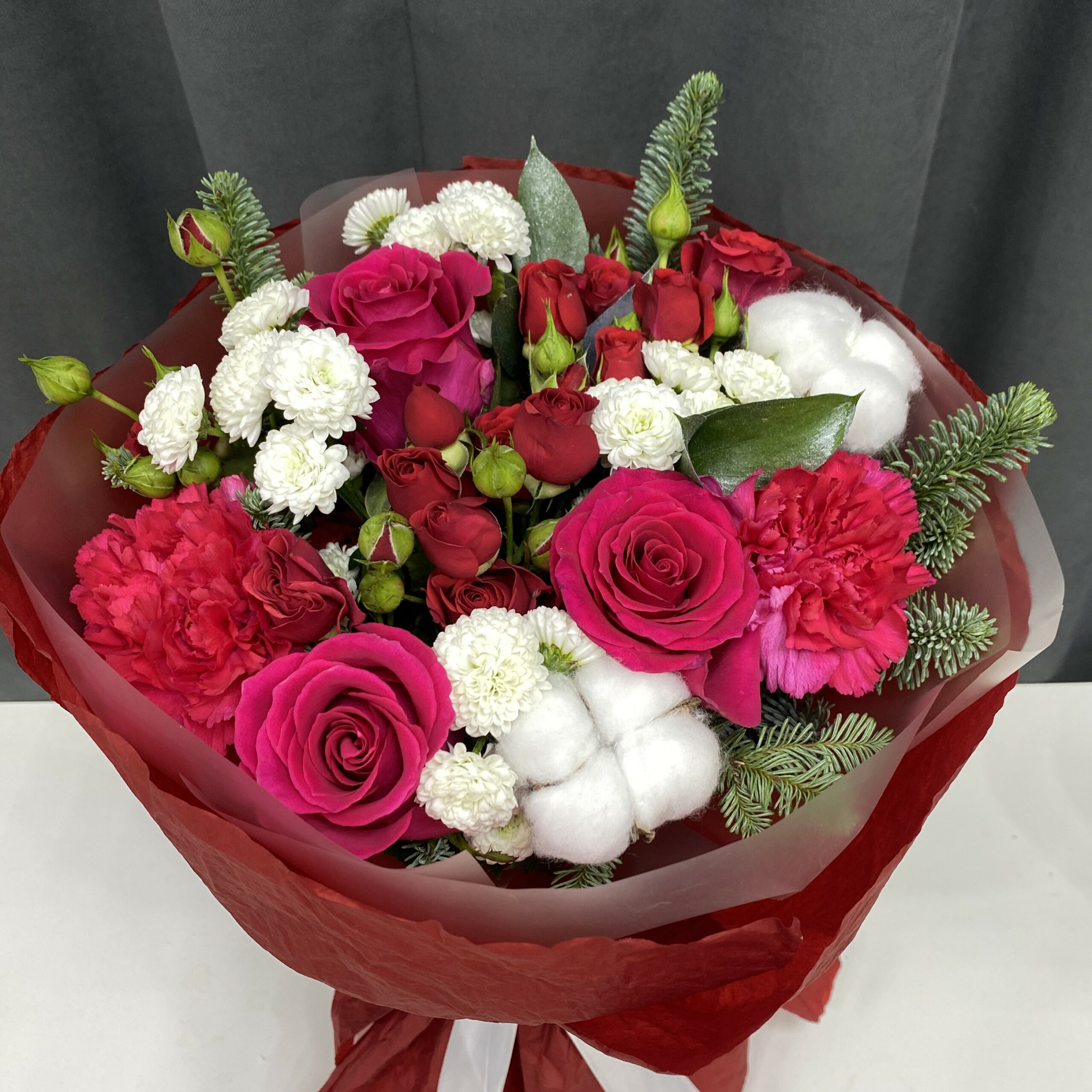 Этот изысканный букет сочетает в себе нежность малиновой розы, страсть красной кустовой розы и мягкую естественность белого хлопка. Такая композиция выглядит элегантно и оригинально, гармонично объединяя яркие и спокойные оттенки.