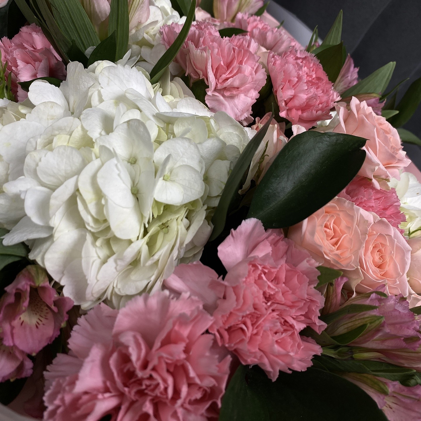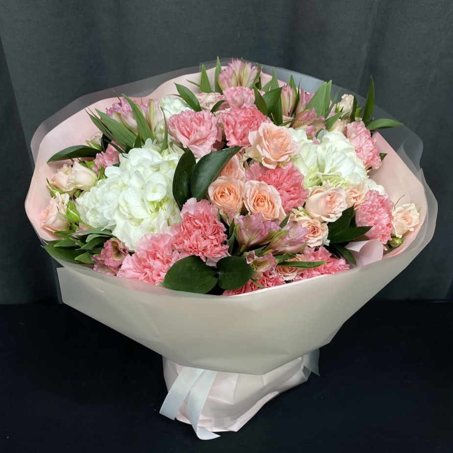 Состав: Рускус, Альстромерия розовая – 5 шт, Диантус розовый – 14 шт, Гортензия белая – 3 шт, Лента (атласная), Упаковка (дизайнерская пленка).