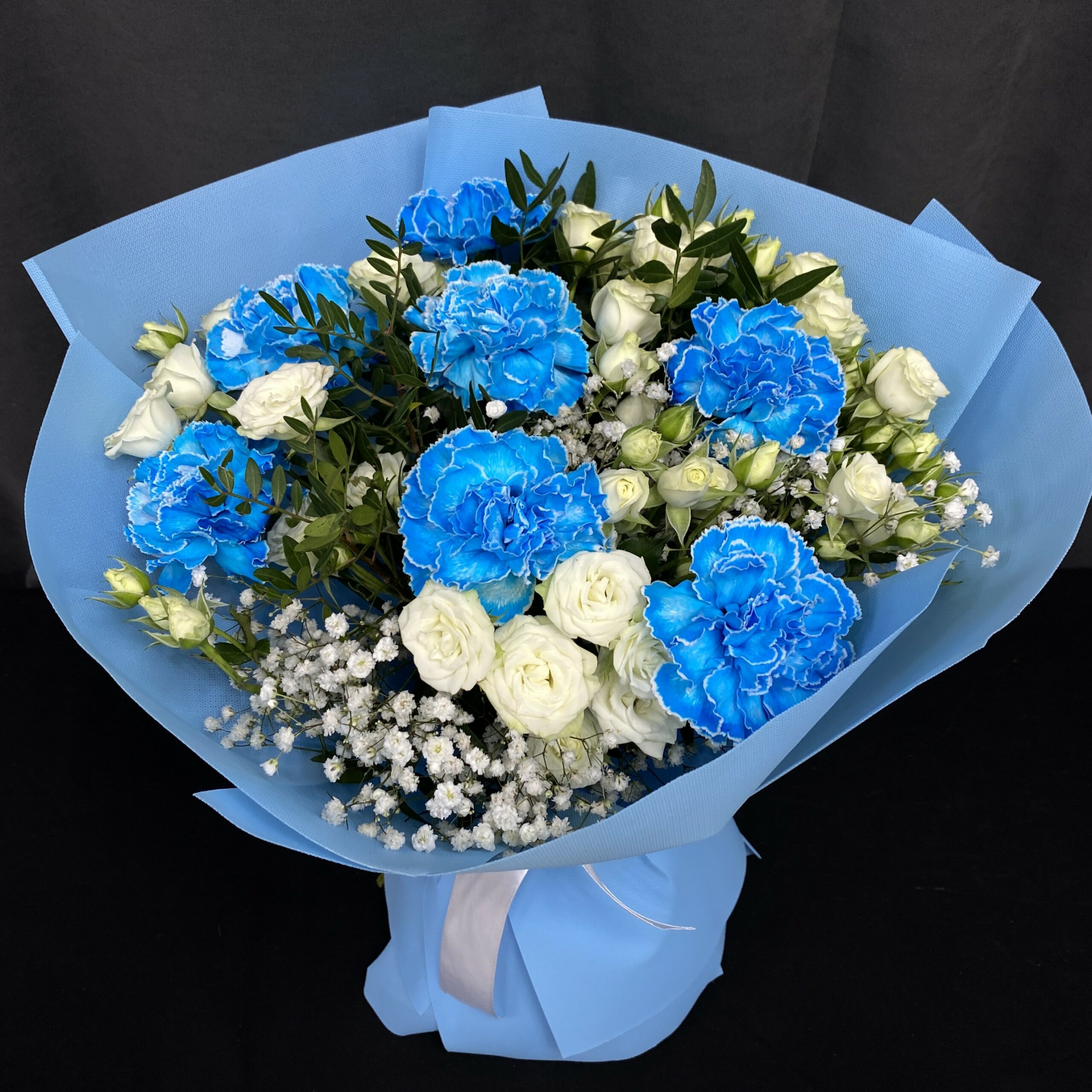 Этот букет – идеальное сочетание загадочности и свежести для тех, кто ценит глубину цвета и природную гармонию. Сочетание насыщенных синих гвоздик и экзотических зеленых роз Грин Глоу создает монументальную композицию, где холодные, глубокие оттенки морской волны и изумруда переливаются, а воздушная гипсофила и фисташка добавляют легкость и структуру, даря ощущение прохлады, тайны и умиротворения.
