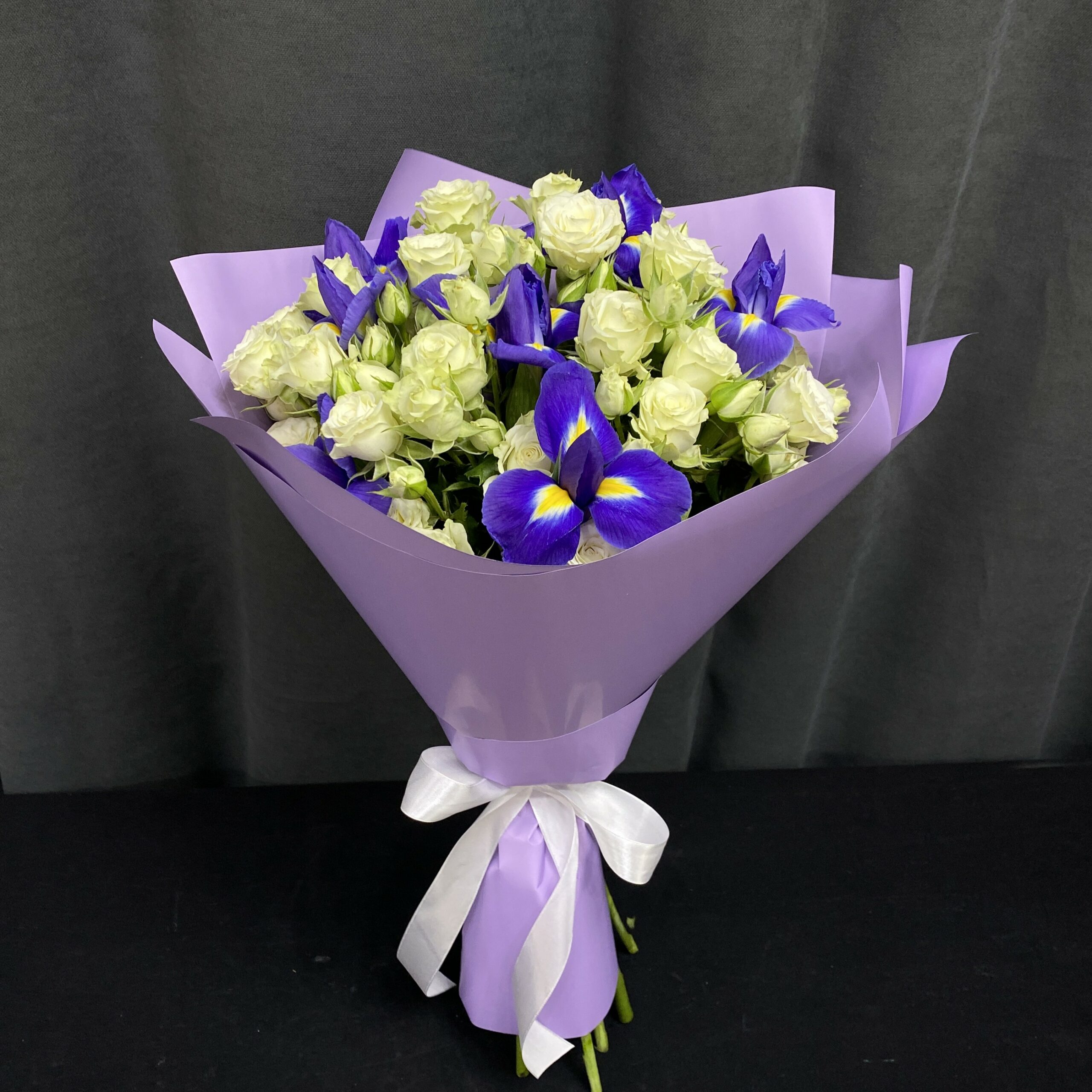 Состав: Ирис синий – 7 шт, Кустовая роза светло-зеленая – 4 шт, Лента (атласная), Упаковка (дизайнерская пленка).