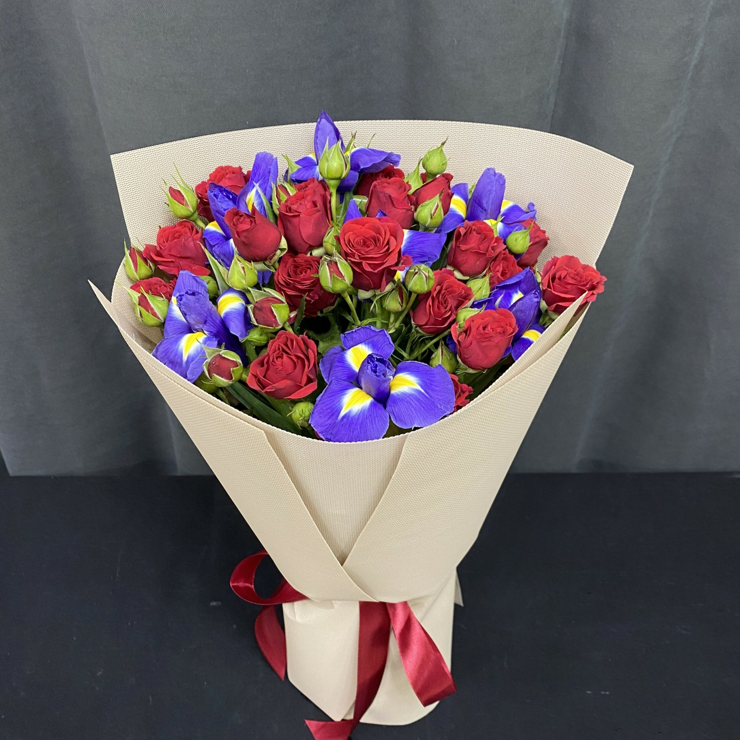 Состав: Ирис синий – 7 шт, Кустовая роза красная – 4 шт, Лента (атласная), Упаковка (дизайнерская пленка).