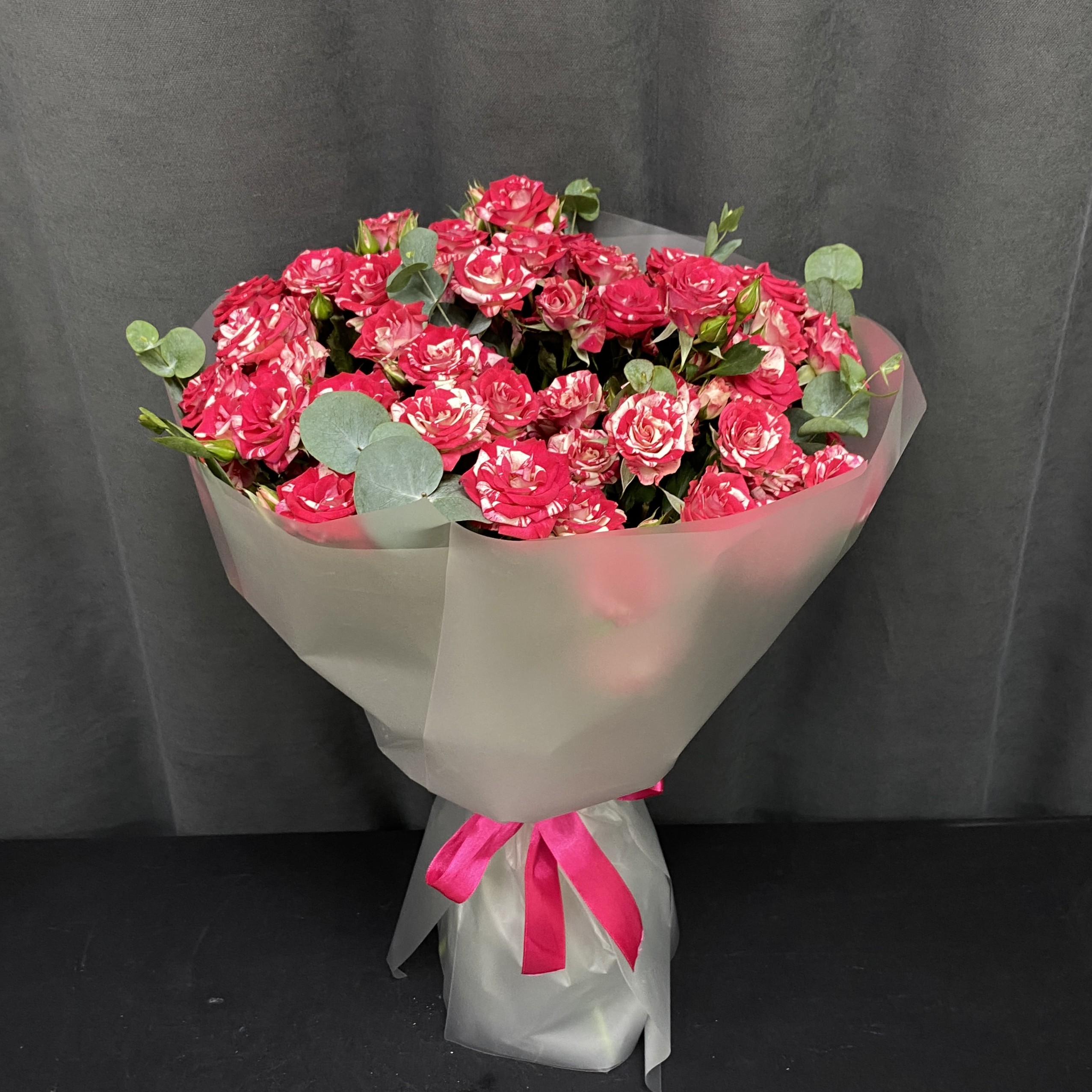 Состав: Кустовая роза малиново-белая – 9 шт, Эвкалипт, Лента (атласная), Упаковка (дизайнерская пленка).