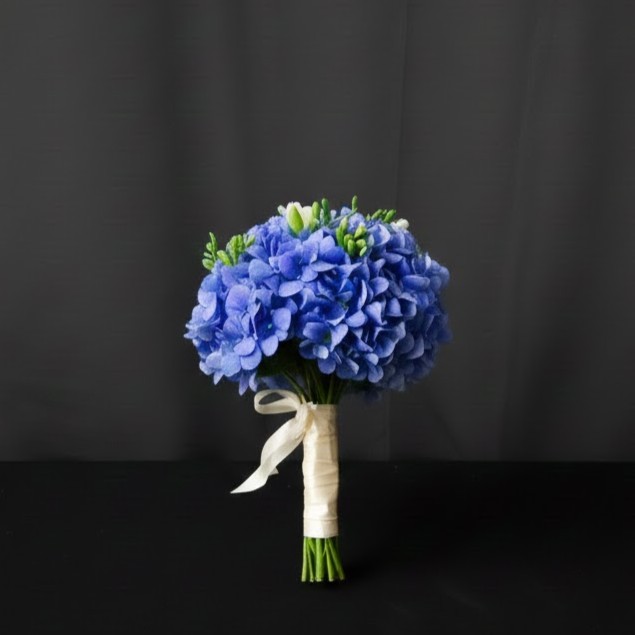 Состав: Гортензия разноцветная – 3 шт, Фрезия белая – 8 шт, Лента (атласная).