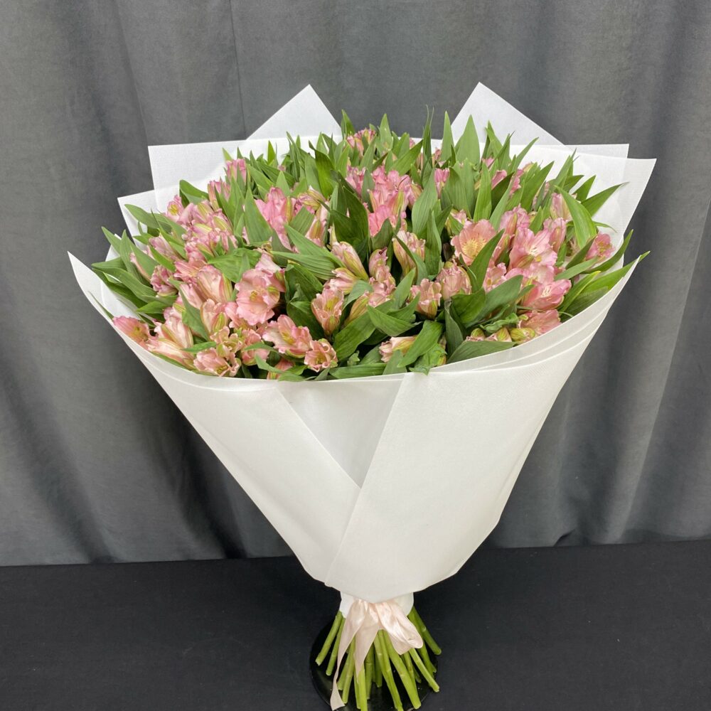 Этот букет – идеальное сочетание романтичной мягкости и структурной выразительности для тех, кто ценит баланс между нежностью и четкостью линий. Сочетание множества нежно-розовых хризантем Сантини, изящных белых эустом и графичных ветвей рускуса создает объемную композицию, где воздушные соцветия гармонично сочетаются с архитектурной зеленью, даря ощущение легкости и умиротворения.