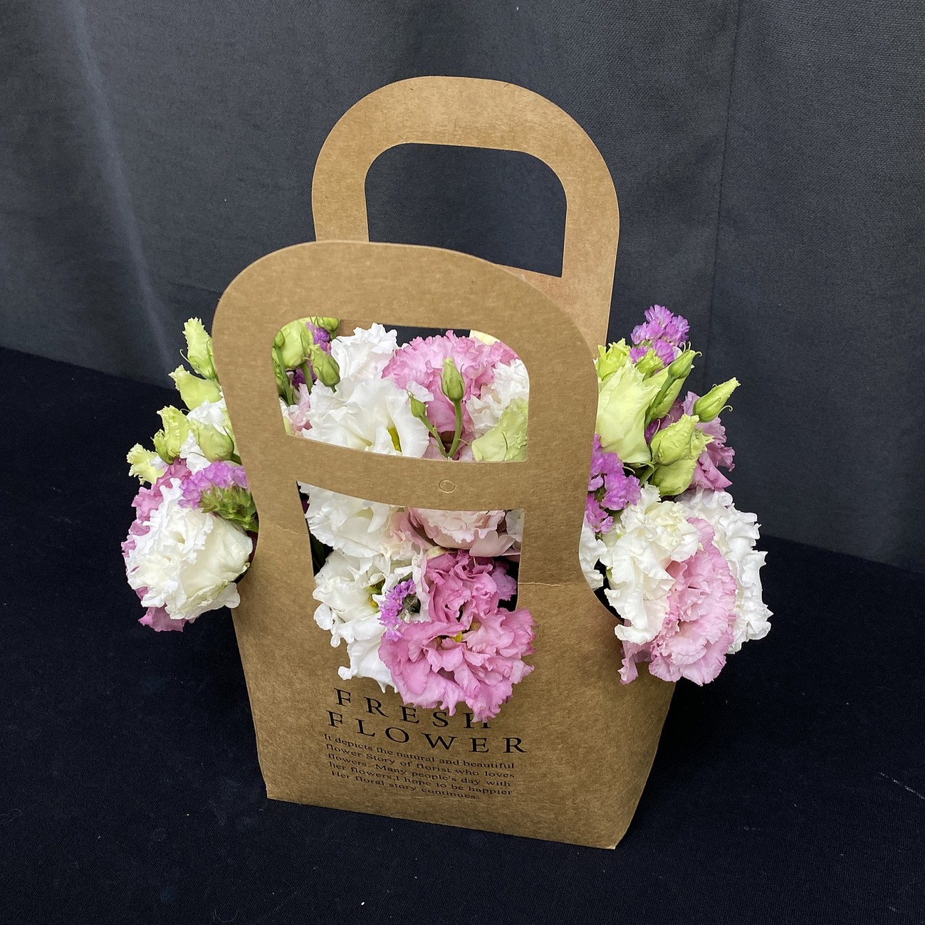 Состав: Эустома белая (лизиантус) – 4 шт, Эустома розовая (лизиантус) – 3 шт, Статица белая, Упаковка (дизайнерская пленка), Плайм пакет, Оазис.
