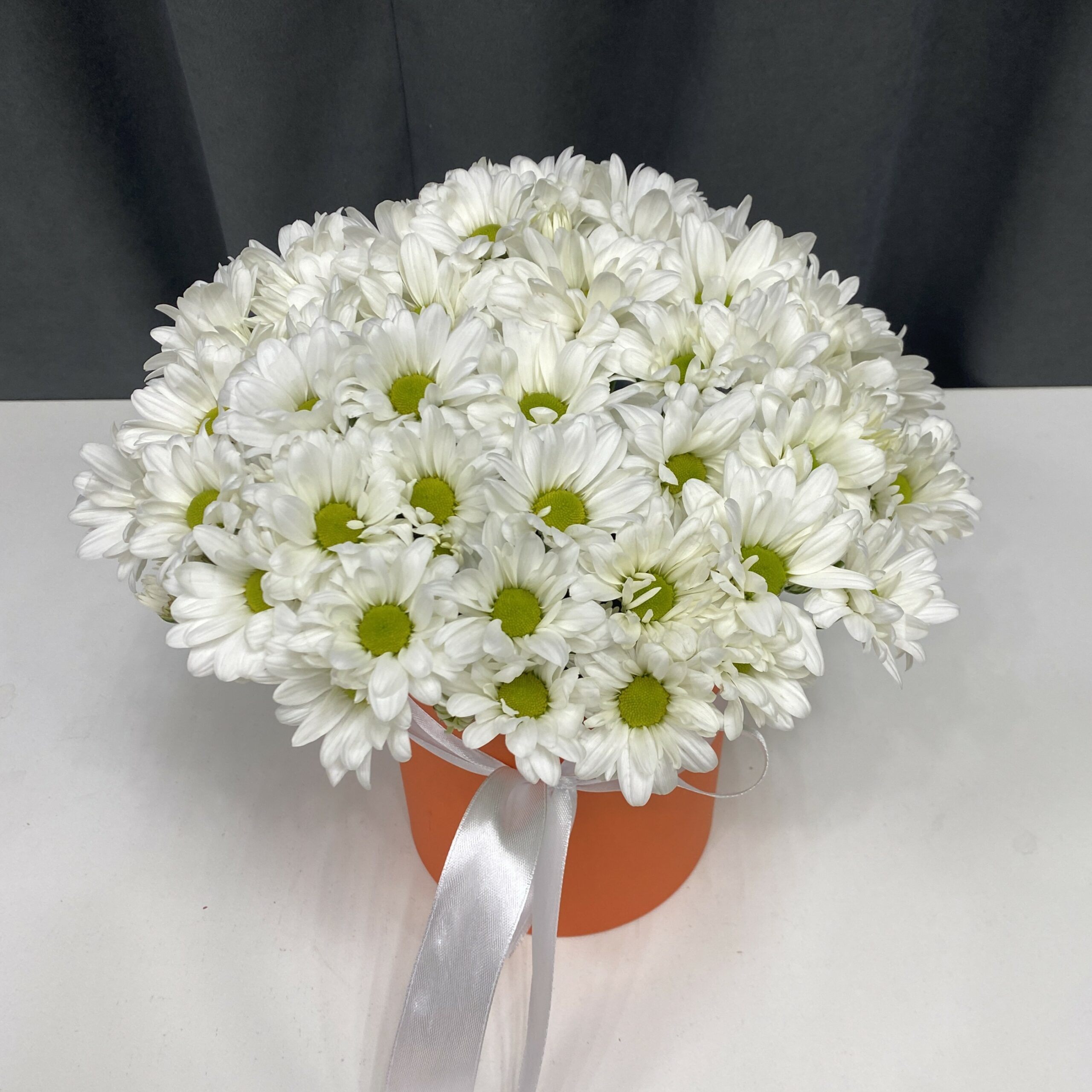 Состав: Хризантема кустовая белая – 5 шт, Лента (атласная), Упаковка (дизайнерская пленка), Оазис, Шляпная коробка.
