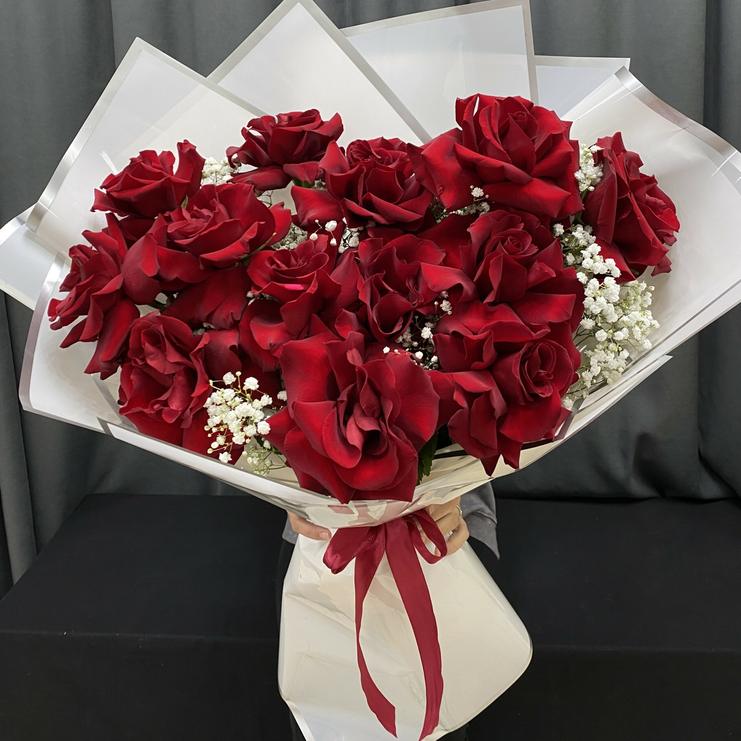 • Эффектная Классика: Сочетание красной розы и гипсофилы – это вечная классика, которая всегда выглядит роскошно и уместно.
