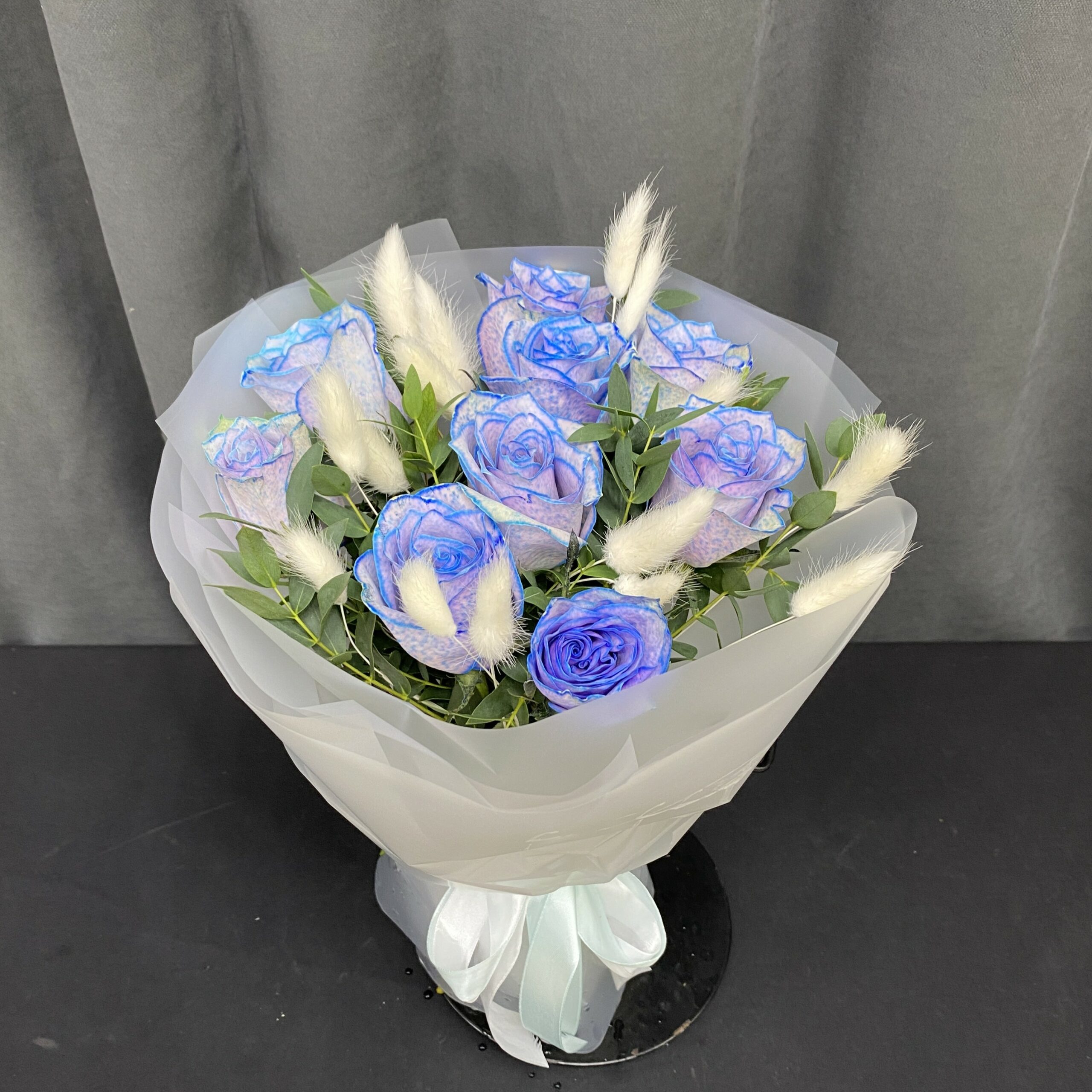 • Уникальный дизайн: Бело-голубые кенийские розы выделяются среди традиционных цветов, привнося в ваш подарок оригинальность и стиль.