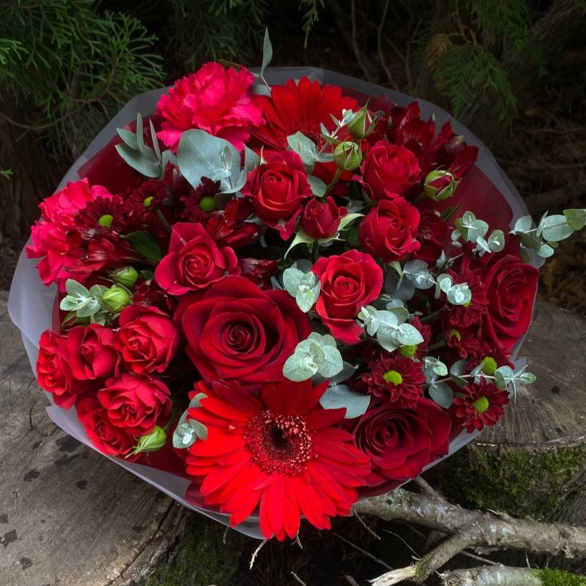 Состав: Альстромерия красная – 2 шт, Диантус малиновый – 1.9 шт, Гербера красная – 2 шт, Кустовая роза красная – 2 шт, Роза красная (Эквадор) 50см – 3 шт, Хризантема сантини разноцветная – 2 шт, Эвкалипт, Лента (атласная), Упаковка (прозрачная пленка).