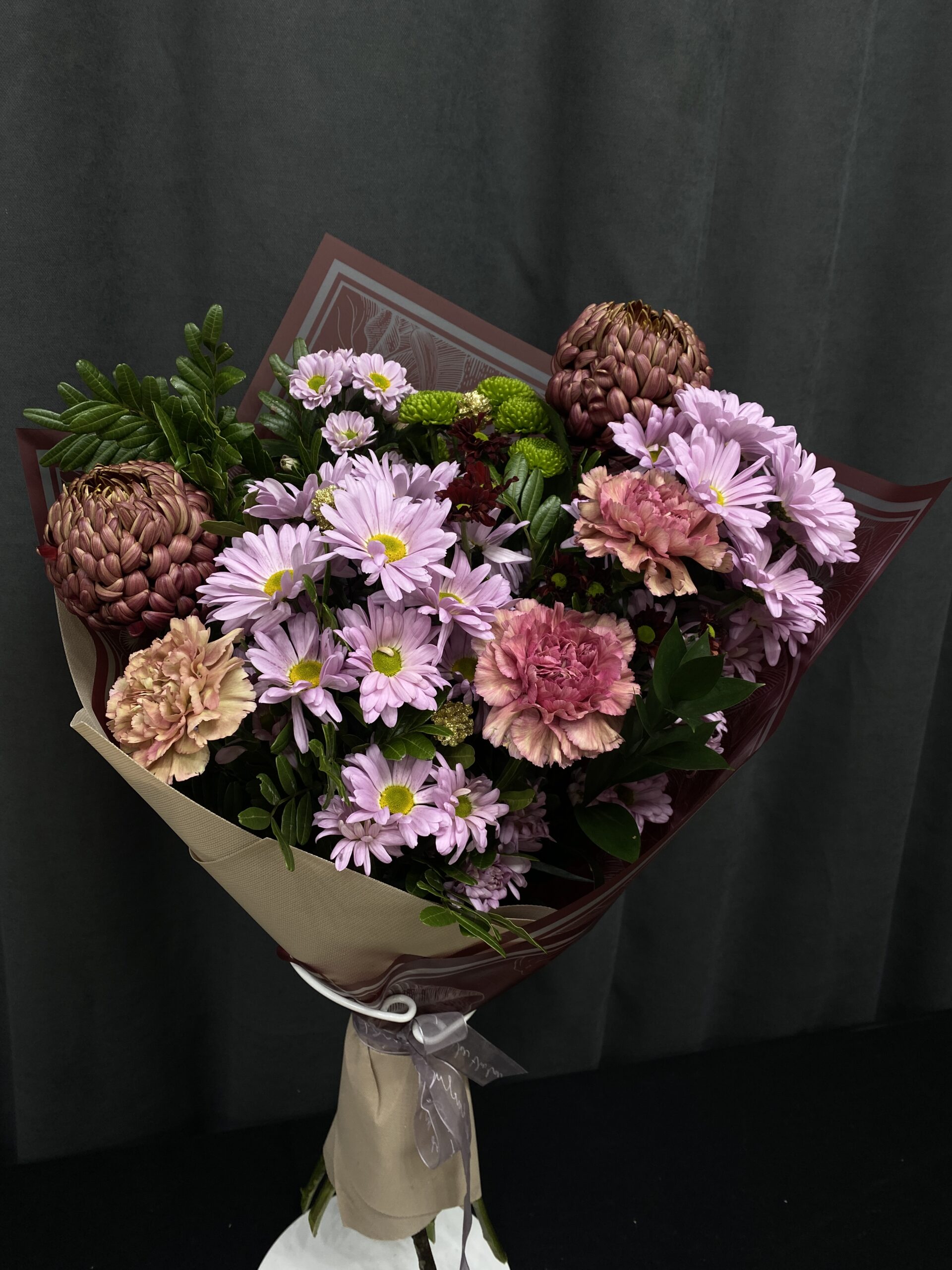 - Выдающаяся стойкость: Практически все компоненты (хризантемы, гвоздики, зелень) известны своей феноменальной стойкостью. Букет будет долго стоять, медленно меняясь, но сохраняя общее очарование.