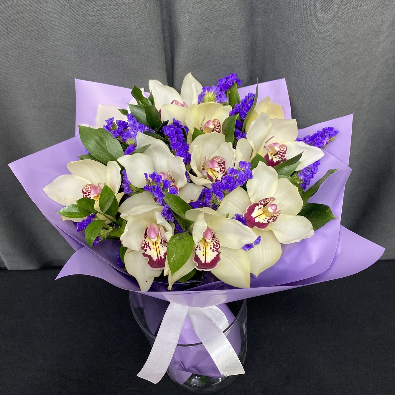 - Оригинальность: Необычное сочетание синей статицы и белых орхидей придает букету неповторимый вид.
