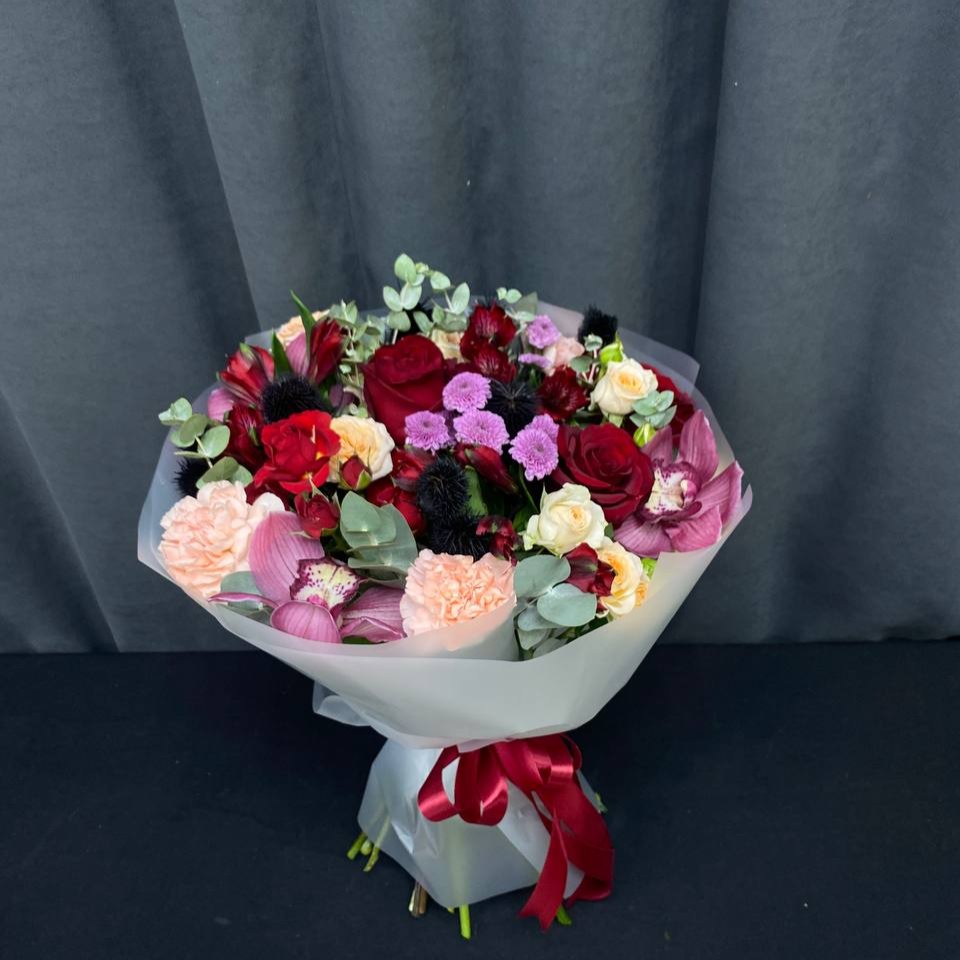 Погрузитесь в мир утонченной красоты с нашим великолепным букетом, состоящим из нежных кустовых роз, хризантем, орхидей и диантусов. Этот роскошный цветочный ансамбль станет идеальным подарком для любого случая и порадует сердце каждого получателя.