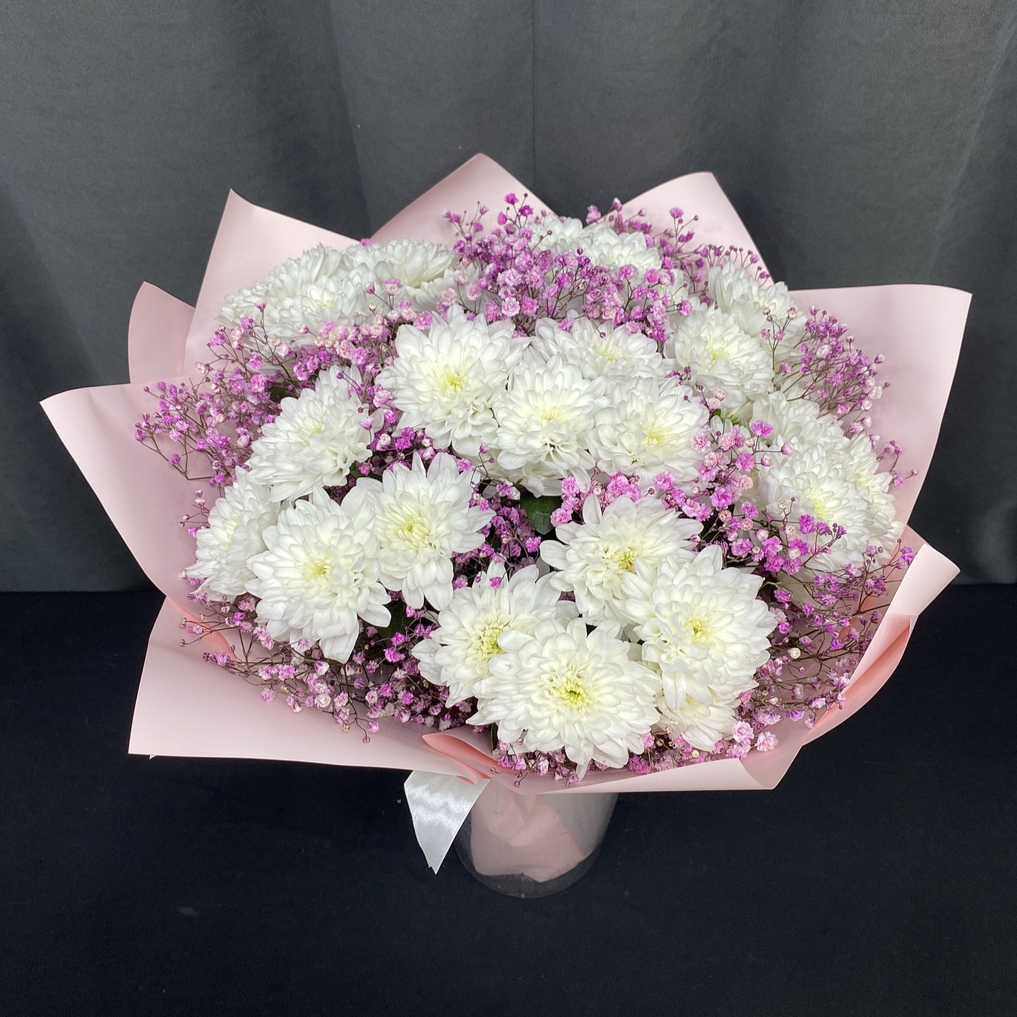 • Необычный дизайн: композиция из гипсофилы и хризантем выглядит свежо и стильно, особенно в дизайнерской упаковке.