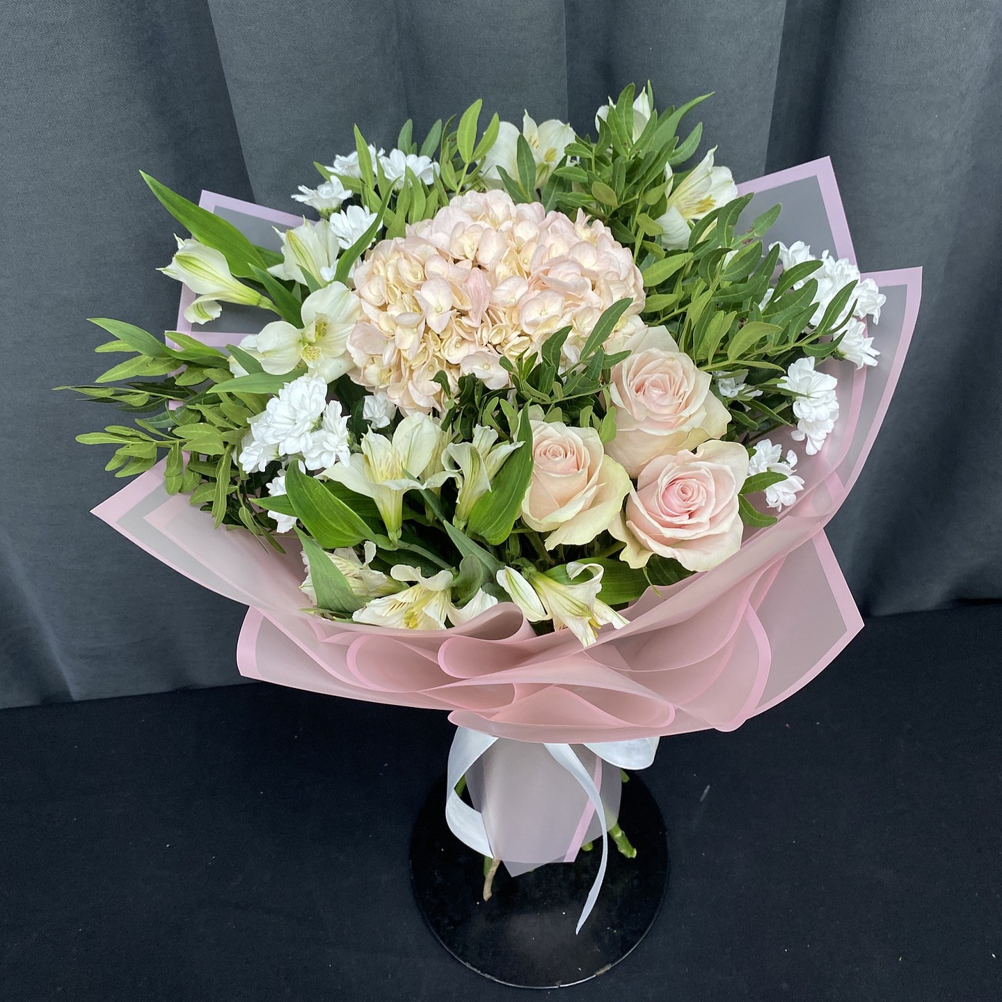 Погрузитесь в мир изысканной красоты с нашим букетом, состоящим из нежных альстромерий, гортензий, хризантем и роз. Этот великолепный ансамбль цветов создан, чтобы передать ваши самые искренние чувства и сделать любой момент особенным.