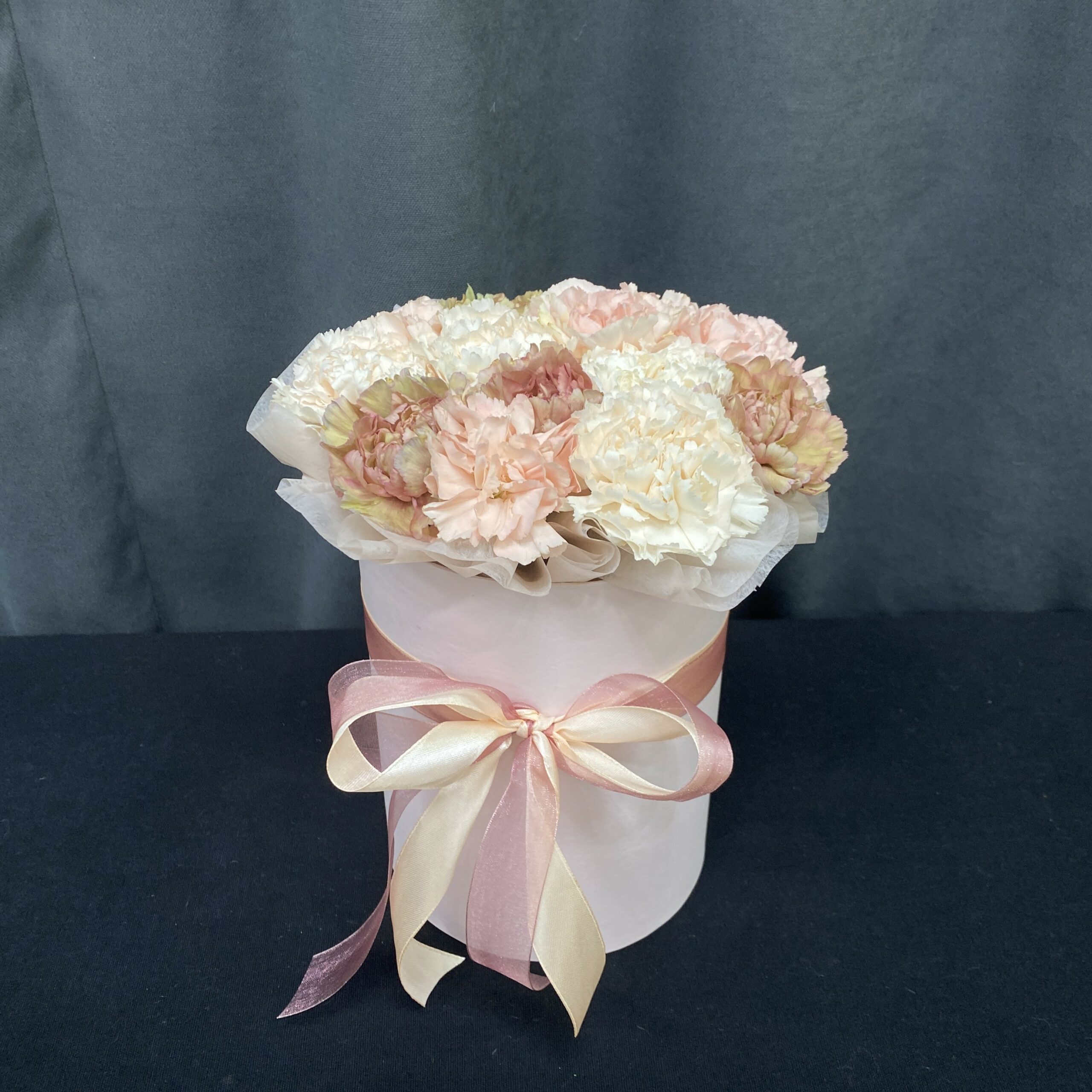 Состав: Диантус кремовый – 5 шт, Диантус персиковый – 4 шт, Диантус коричнево-зеленый – 4 шт, Лента (атласная), Упаковка (прозрачная пленка), Оазис, Шляпная коробка.