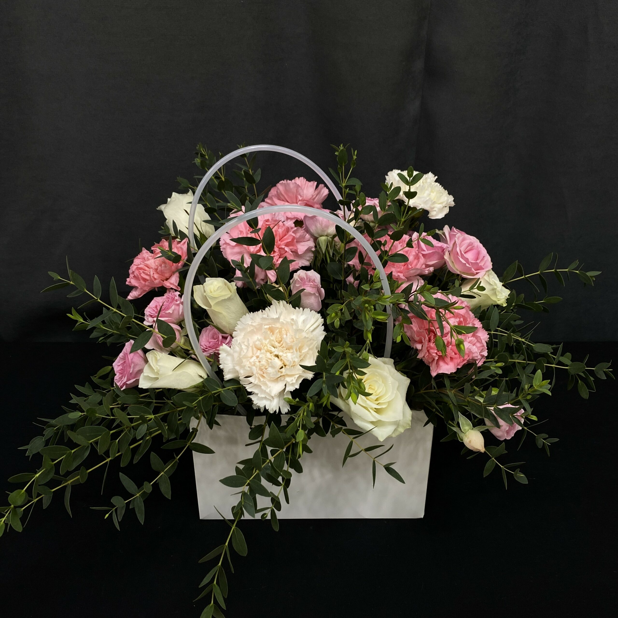 Состав: Диантус кустовой розовый – 5 шт, Диантус кремовый – 2 шт, Кустовая роза розовая – 3 шт, Роза белая (Кения) 40см – 5 шт, Эвкалипт, Лента (атласная), Упаковка (дизайнерская пленка), Оазис, Плайм пакет.