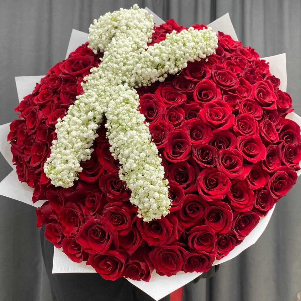 Состав: Гипсофила белая – 4 шт, Роза красная (Эквадор) 60см – 151 шт, Лента (атласная), Упаковка (прозрачная пленка).