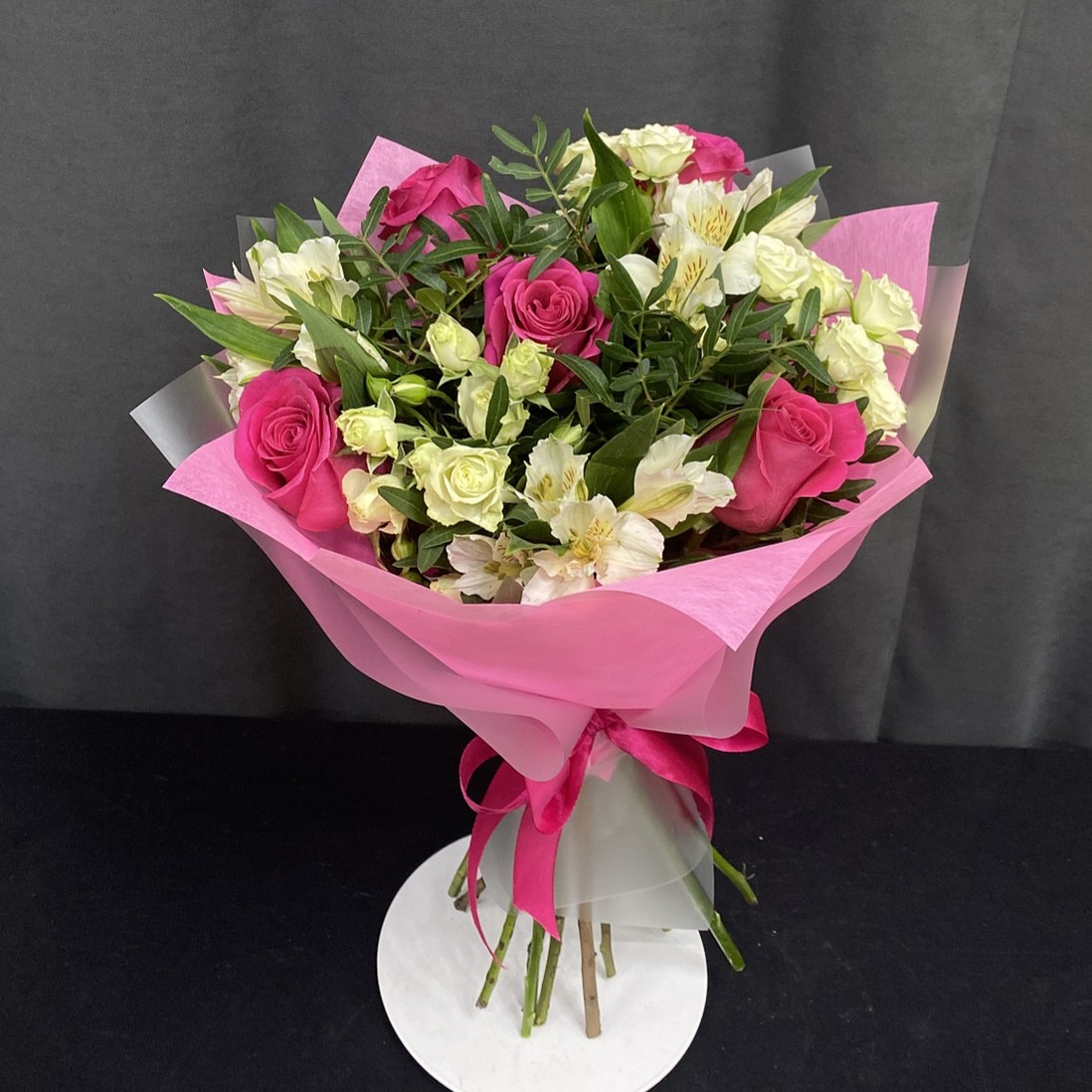 Малиновые розы и белые альстромерии — страсть, смягченная нежностью.