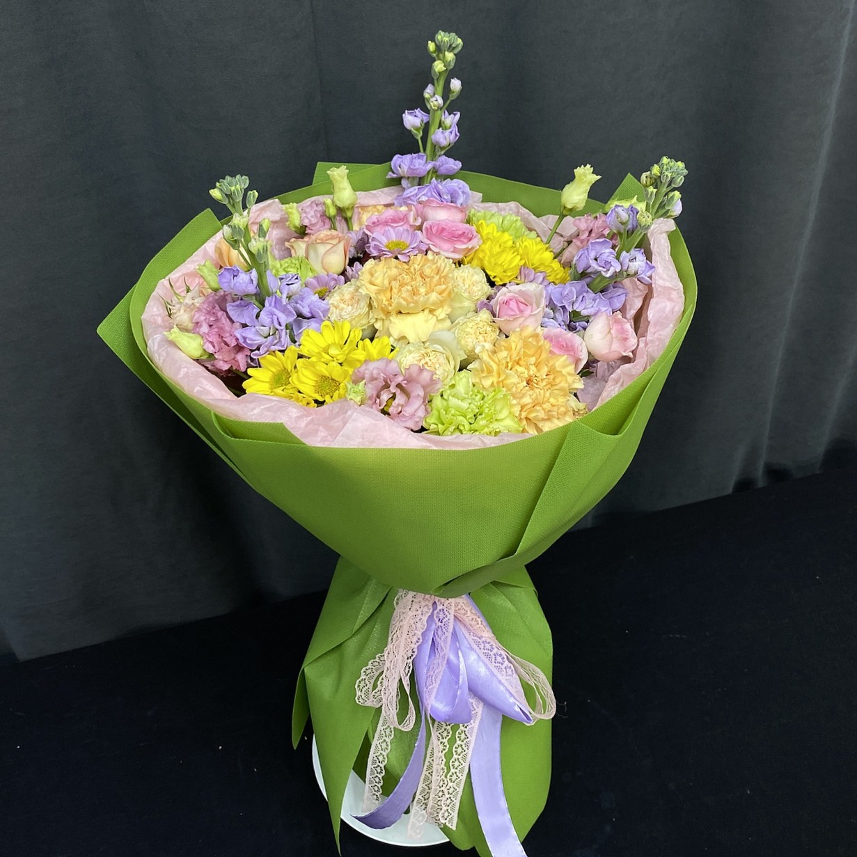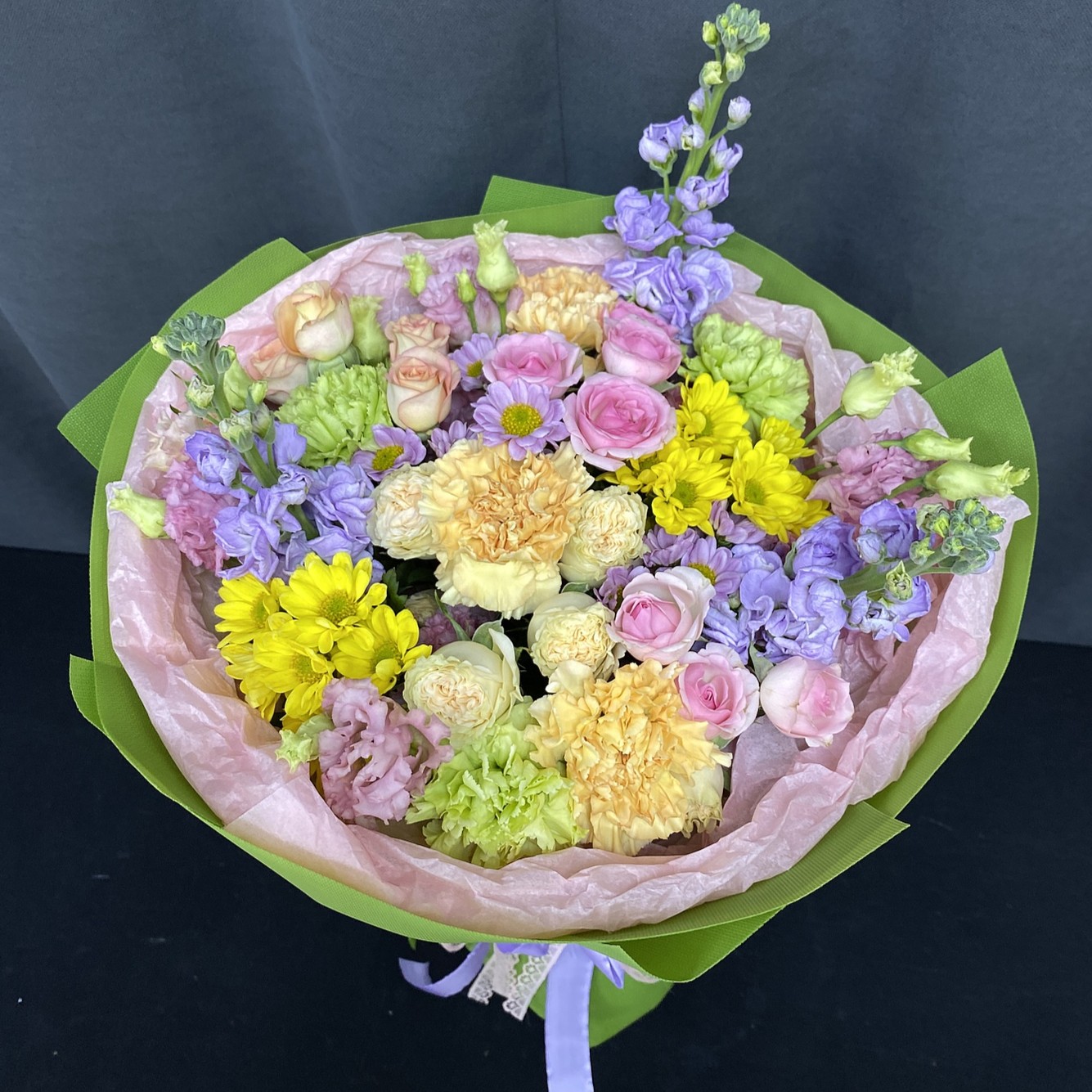 Состав: Диантус персиковый – 3 шт, Диантус зеленый – 3 шт, Кустовая роза кремовая – 1 шт, Кустовая роза розовая – 3 шт, Хризантема сантини – 4 шт, Эустома розовая (лизиантус) – 2 шт, Маттиола – 3 шт, Лента (атласная), Упаковка (дизайнерская пленка).