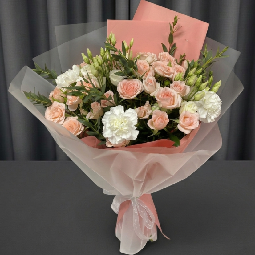 Два вида цветов с различной формой соцветий составляют композицию, где округлые бутоны кустовых роз дополняются воронковидными цветами эустомы. Сочетание двух текстур создает объемную и фактурную сборку без использования дополнительной зелени. Такие букеты выбирают для получателей, ценящих элегантность и утонченность в цветочных решениях.