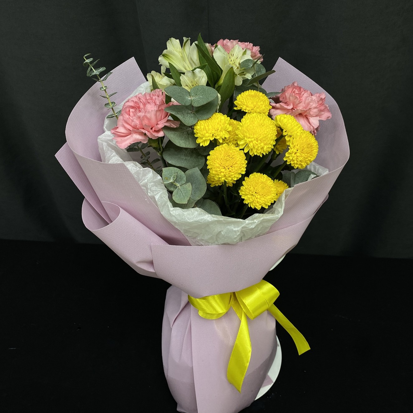 Состав: Альстромерия белая – 1 шт, Диантус розовый – 3 шт, Хризантема кустовая желтая – 1 шт, Эвкалипт, Лента (атласная), Упаковка (дизайнерская пленка).