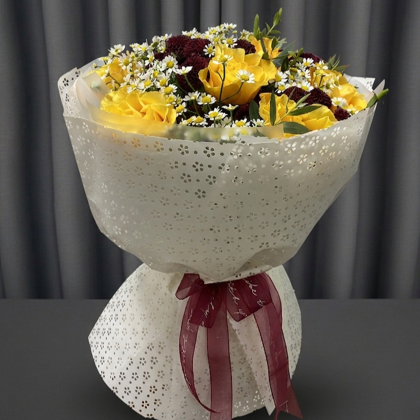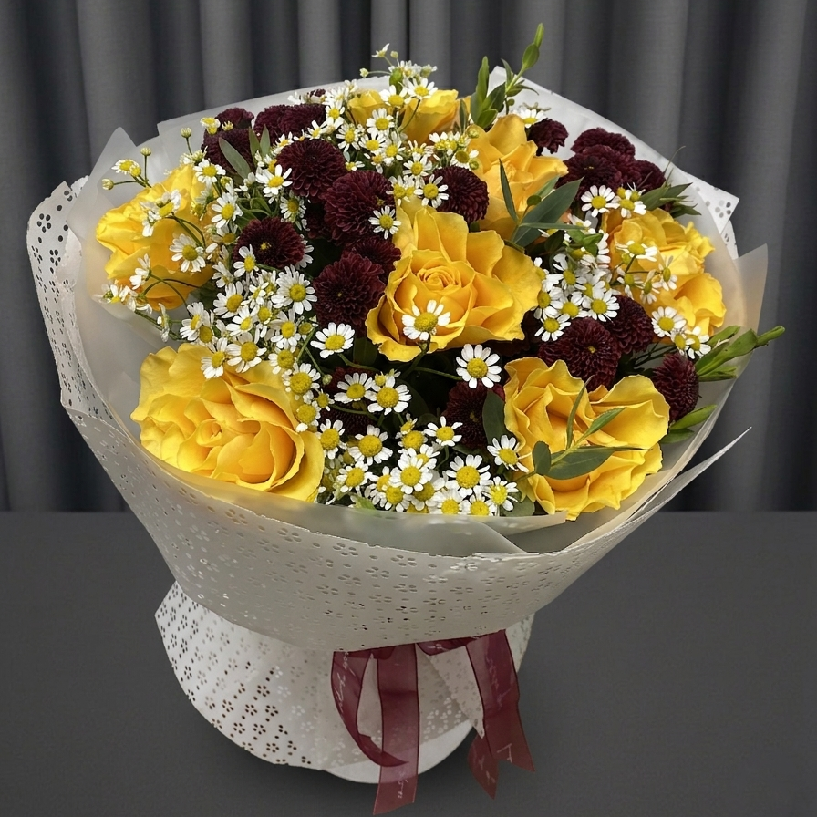 Состав: Кустовая ромашка (полевая) – 4 шт, Роза оранжевая (Кения) 50см – 7 шт, Хризантема сантини разноцветная – 4 шт, Эвкалипт, Лента (атласная), Упаковка (дизайнерская пленка).