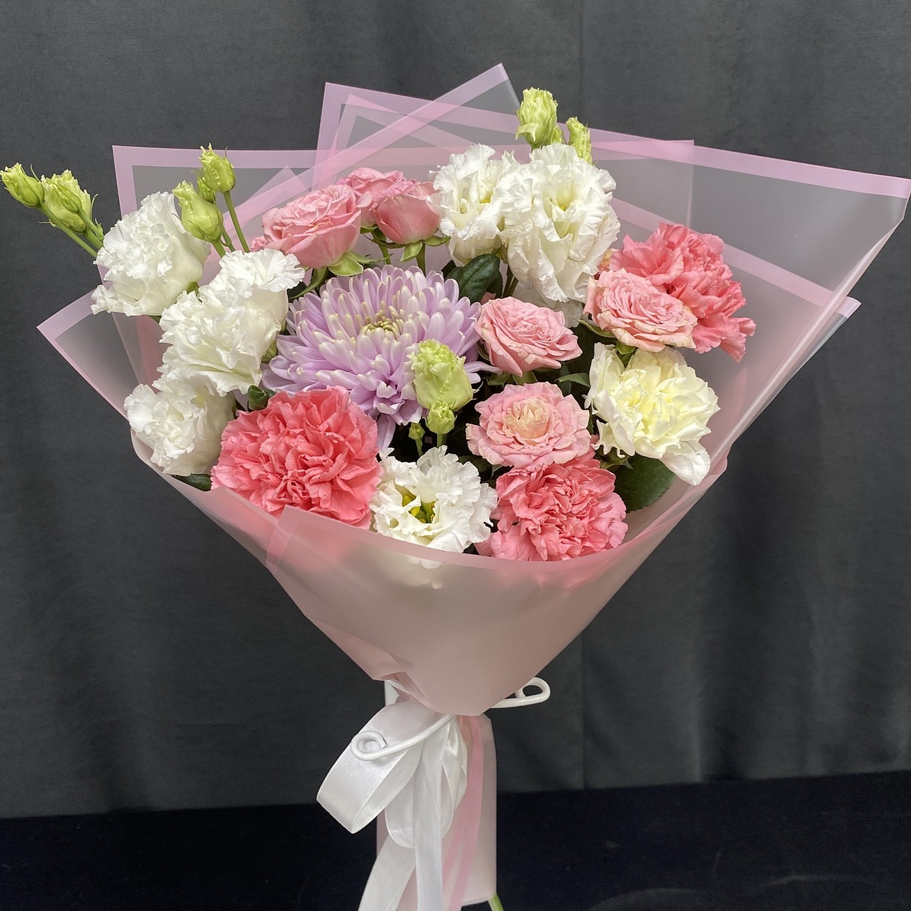Состав: Диантус белый – 1 шт, Диантус розовый – 3 шт, Кустовая роза персиковая – 2 шт, Хризантема одноголовая розовая – 1 шт, Эустома белая (лизиантус) – 2 шт, Лента (атласная), Упаковка (дизайнерская пленка).