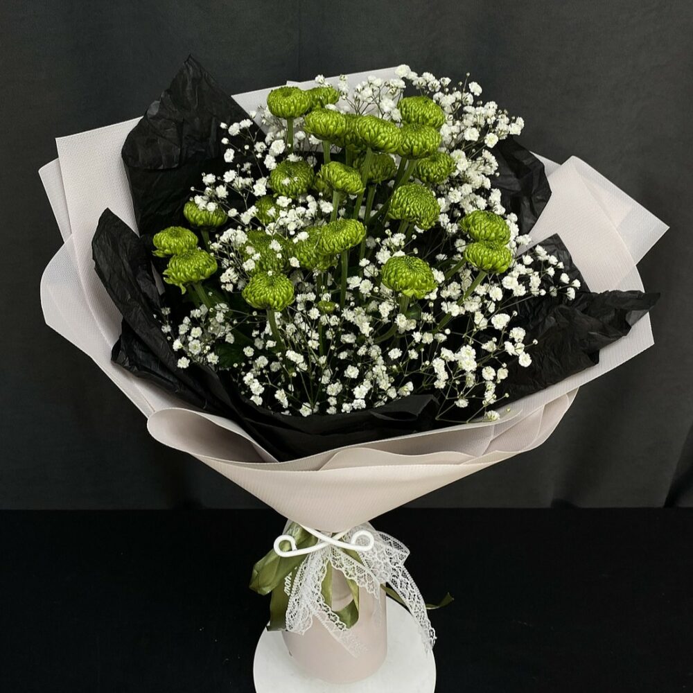 Монокомпозиция из диантусов одного яркого оттенка представляет собой букет, где множественные мелкие соцветия на ветвистых стеблях формируют объемный пышный пучок без использования дополнительных растений. Насыщенный оранжевый цвет и характерная резная форма лепестков делают такой букет визуально ярким и жизнерадостным. Подобные сборки выбирают для ситуаций, предполагающих теплую, дружескую атмосферу.