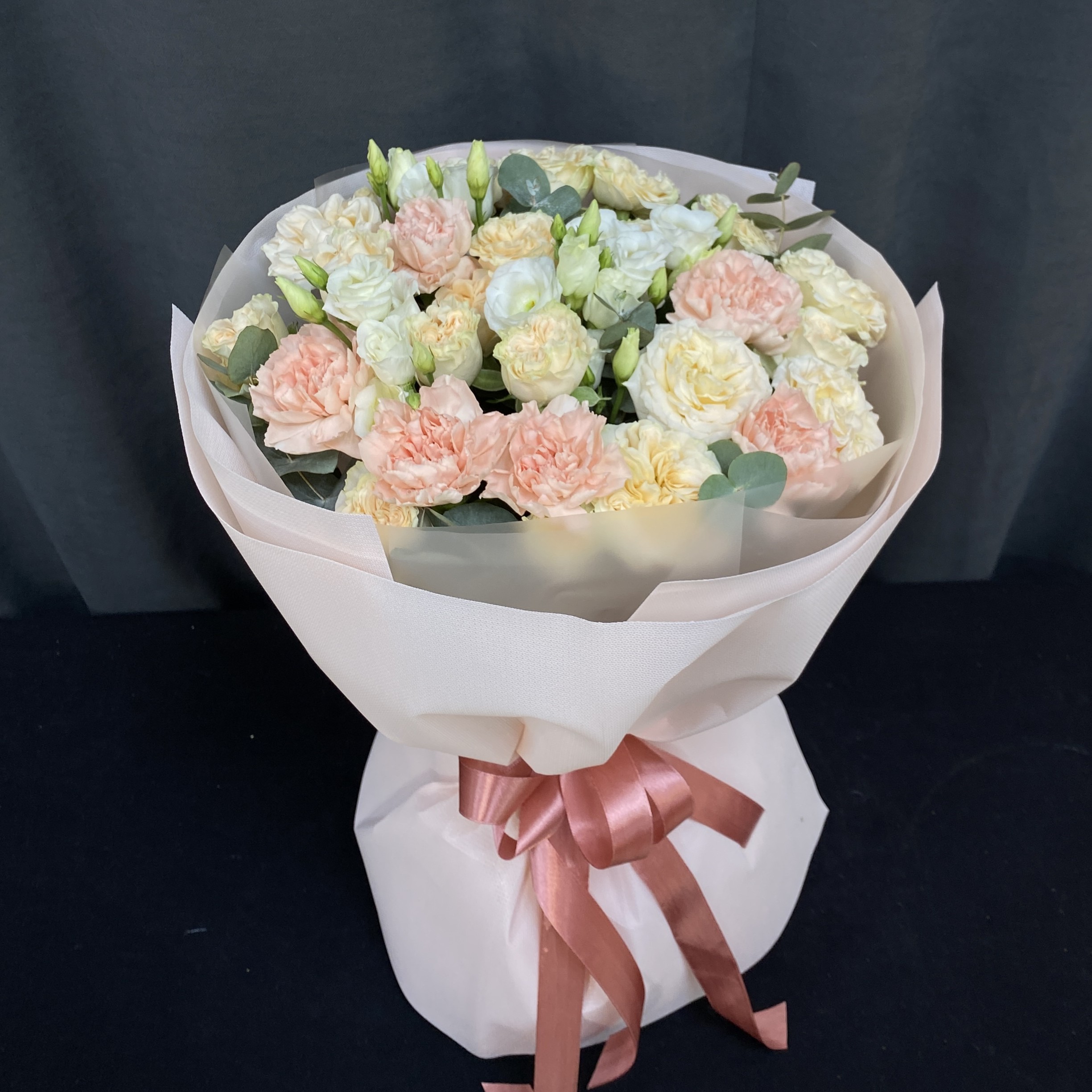 Состав: Диантус персиковый – 7 шт, Кустовая роза кремовая – 5 шт, Эустома белая (лизиантус) – 4 шт, Эвкалипт, Лента (атласная), Упаковка (дизайнерская пленка).