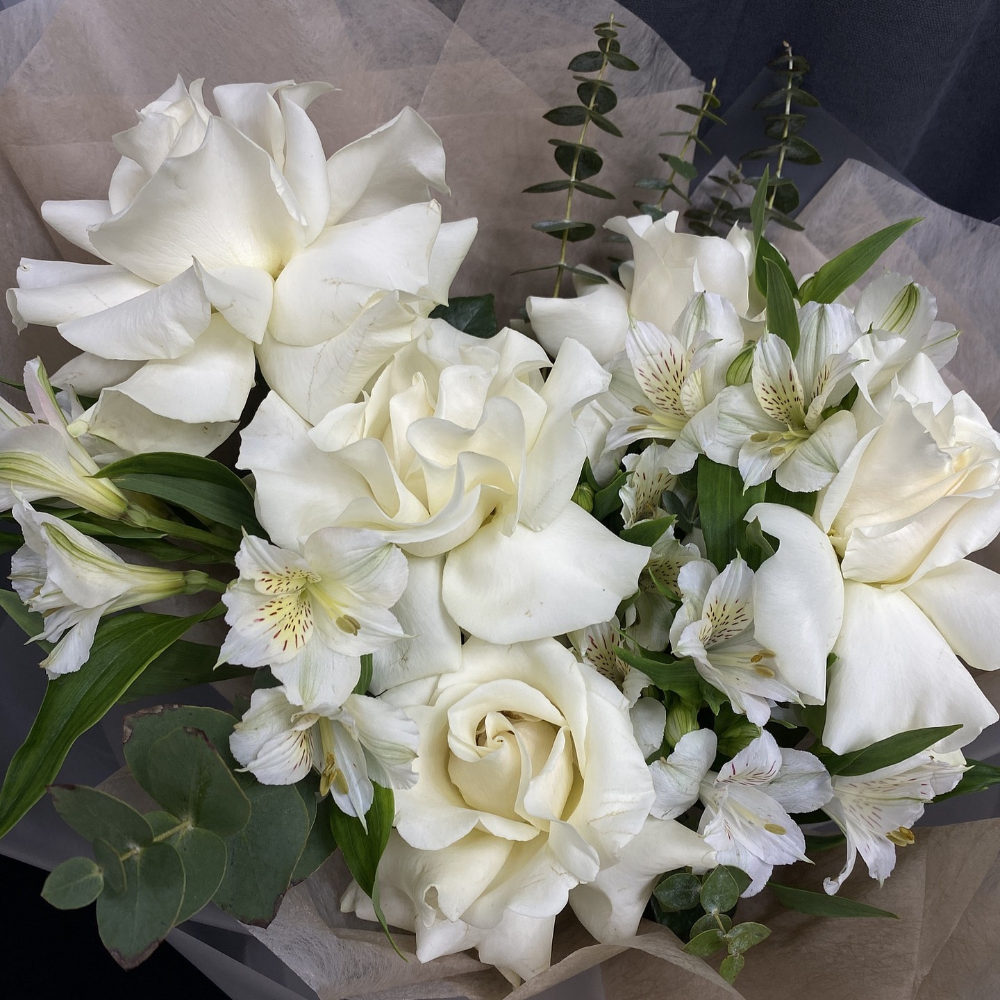 Состав: Альстромерия белая – 4 шт, "Французкие розы" белые – 5 шт, Эвкалипт, Лента (атласная), Упаковка (дизайнерская пленка).