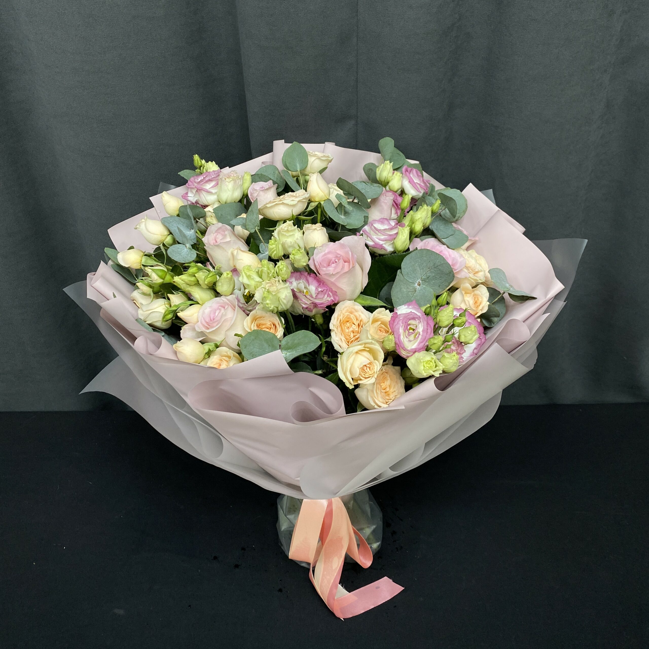 Состав: Кустовая роза кремовая – 6 шт, Роза розовая (Кения) 50см – 7 шт, Эустома бело-розовая (лизиантус) – 6 шт, Эвкалипт, Лента (атласная), Упаковка (дизайнерская пленка).