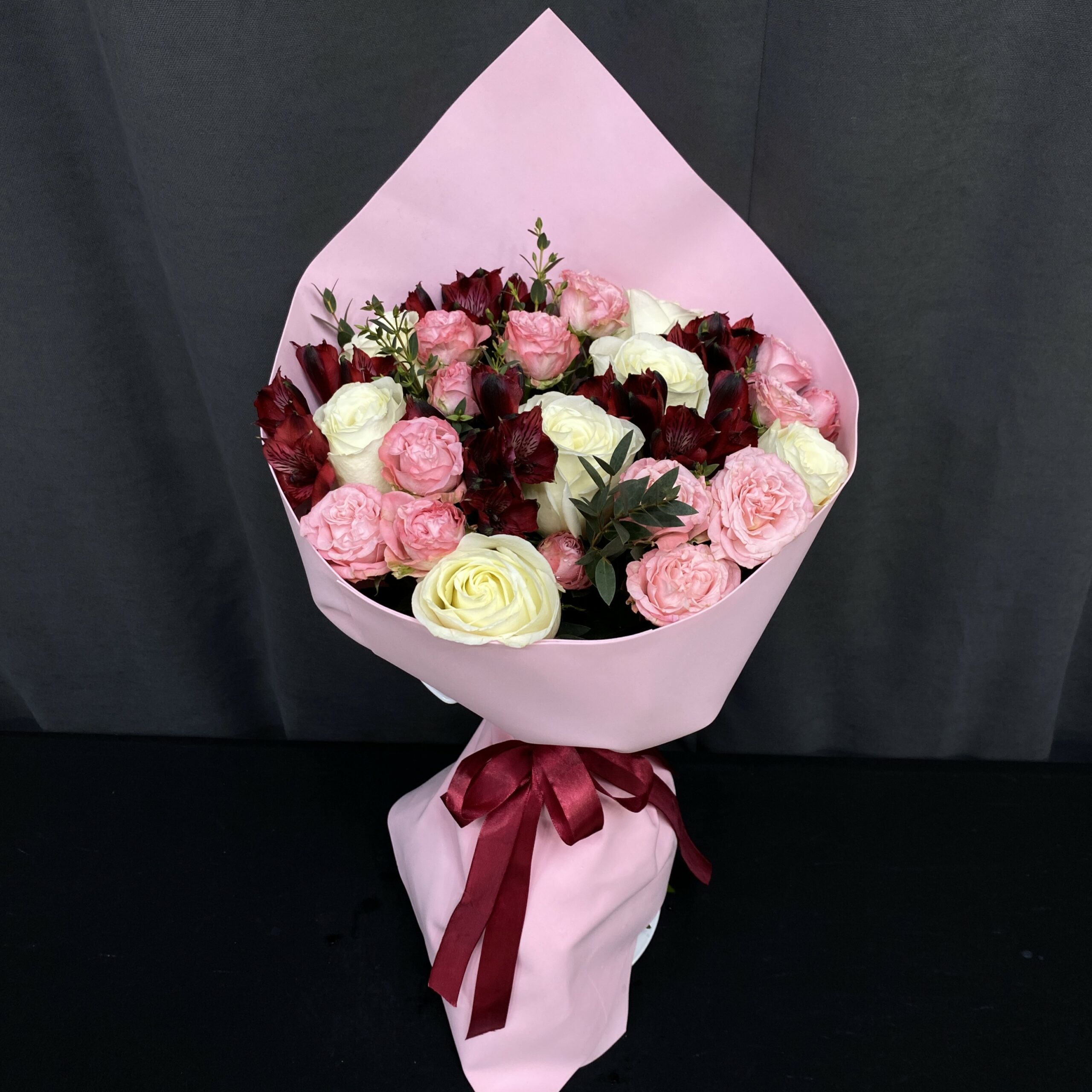 • Элегантное сочетание цветов: Белые розы символизируют чистоту и невинность, красная альстромерия олицетворяет страсть, а розовая кустовая роза добавляет нежности. Вместе они создают гармоничную композицию, которая привлечет внимание и восхищение.