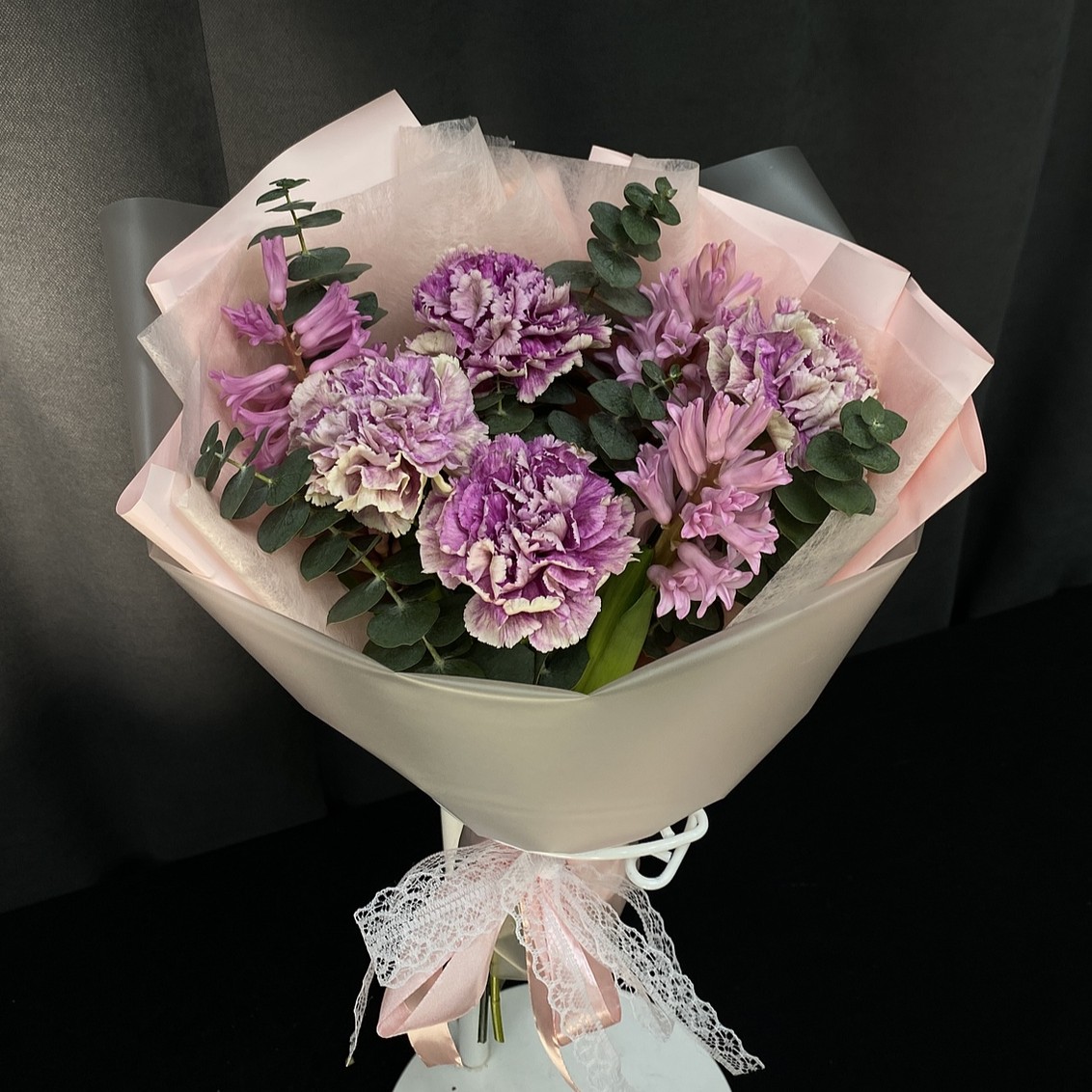 Состав: Диантус сиреневый – 4 шт, Гиацинт розовый – 3 шт, Эвкалипт, Лента (атласная), Упаковка (дизайнерская пленка).