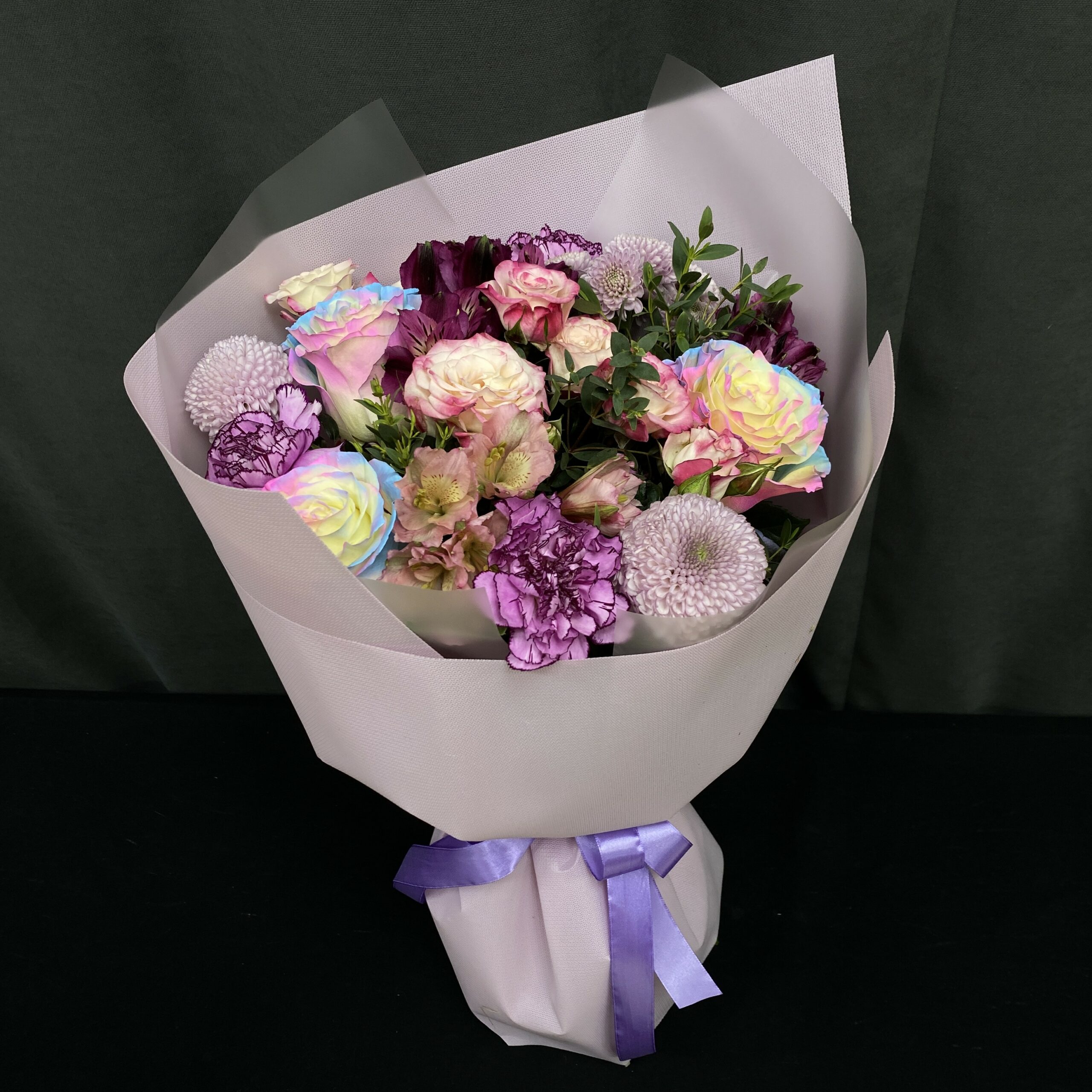 Состав: Альстромерия розовая – 1 шт, Альстромерия фиолетовая – 2 шт, Диантус сиреневый – 3 шт, Кустовая роза бело-розовая – 2 шт, Роза Эквадор Маршмеллоу – 3 шт, Хризантема сантини – 2 шт, Хризантема одноголовая розовая – 2 шт, Эвкалипт, Лента (атласная), Упаковка (дизайнерская пленка).