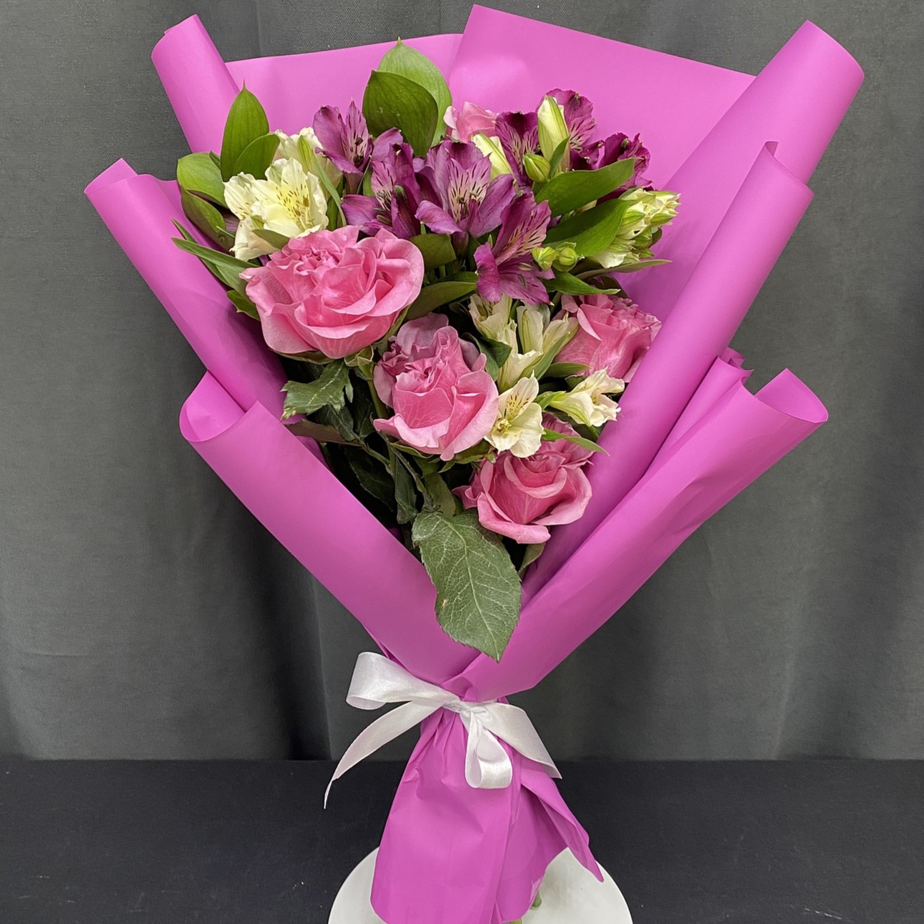 Малиновая роза и альстромерии — доставка по Великому Новгороду