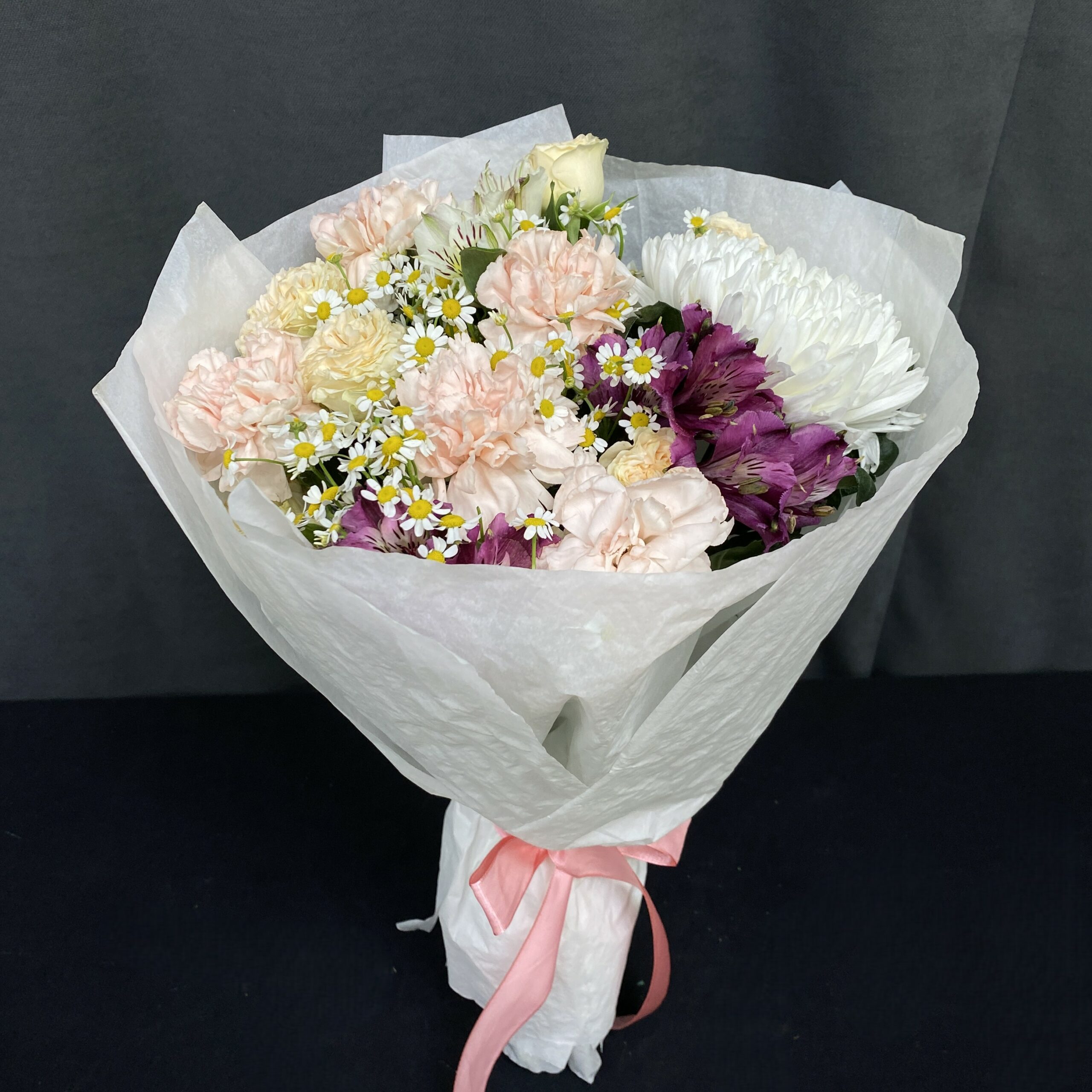 Состав: Альстромерия белая – 1 шт, Альстромерия фиолетовая – 2 шт, Диантус персиковый – 5 шт, Кустовая роза кремовая – 2 шт, Кустовая ромашка (полевая) – 3 шт, Хризантема одноголовая белая – 1 шт, Лента (атласная), Упаковка (дизайнерская пленка).