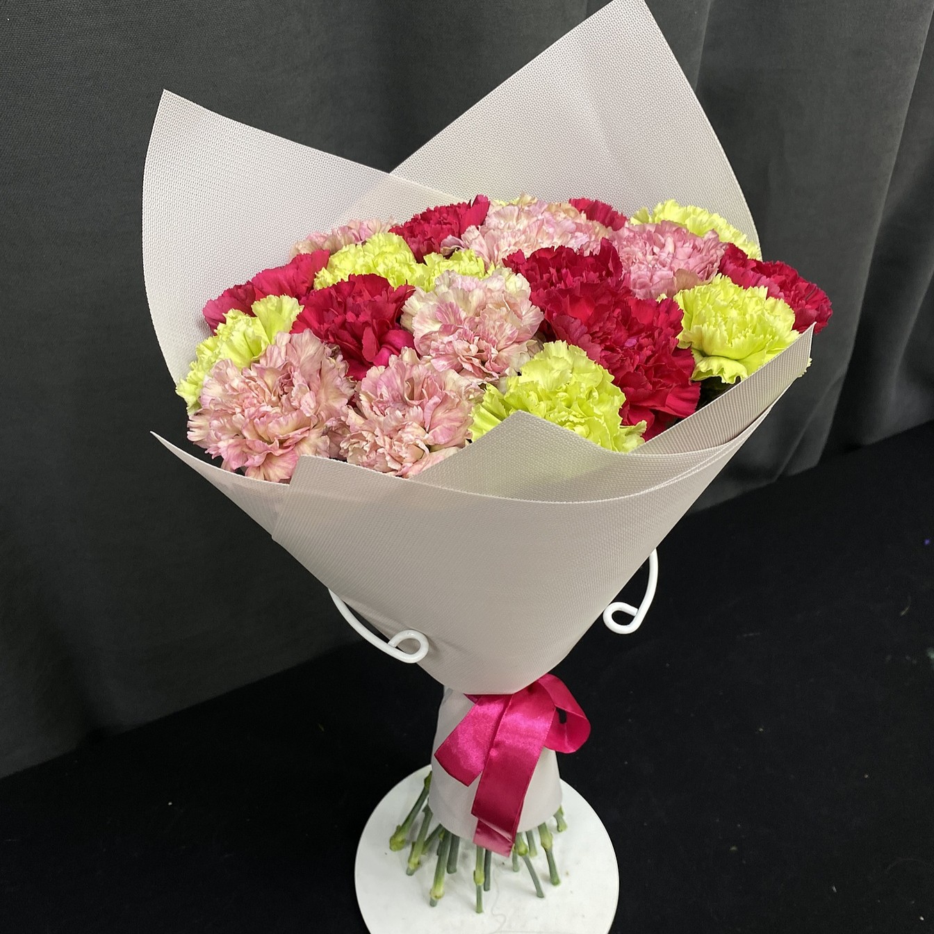 Состав: Диантус красный – 7 шт, Диантус розовый – 7 шт, Диантус желтый – 7 шт, Лента (атласная), Упаковка (крафтовая бумага).