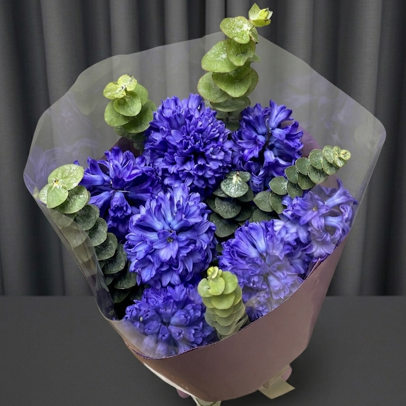 Состав: Гиацинт синий – 7 шт, Эвкалипт, Лента (атласная), Упаковка (дизайнерская пленка).
