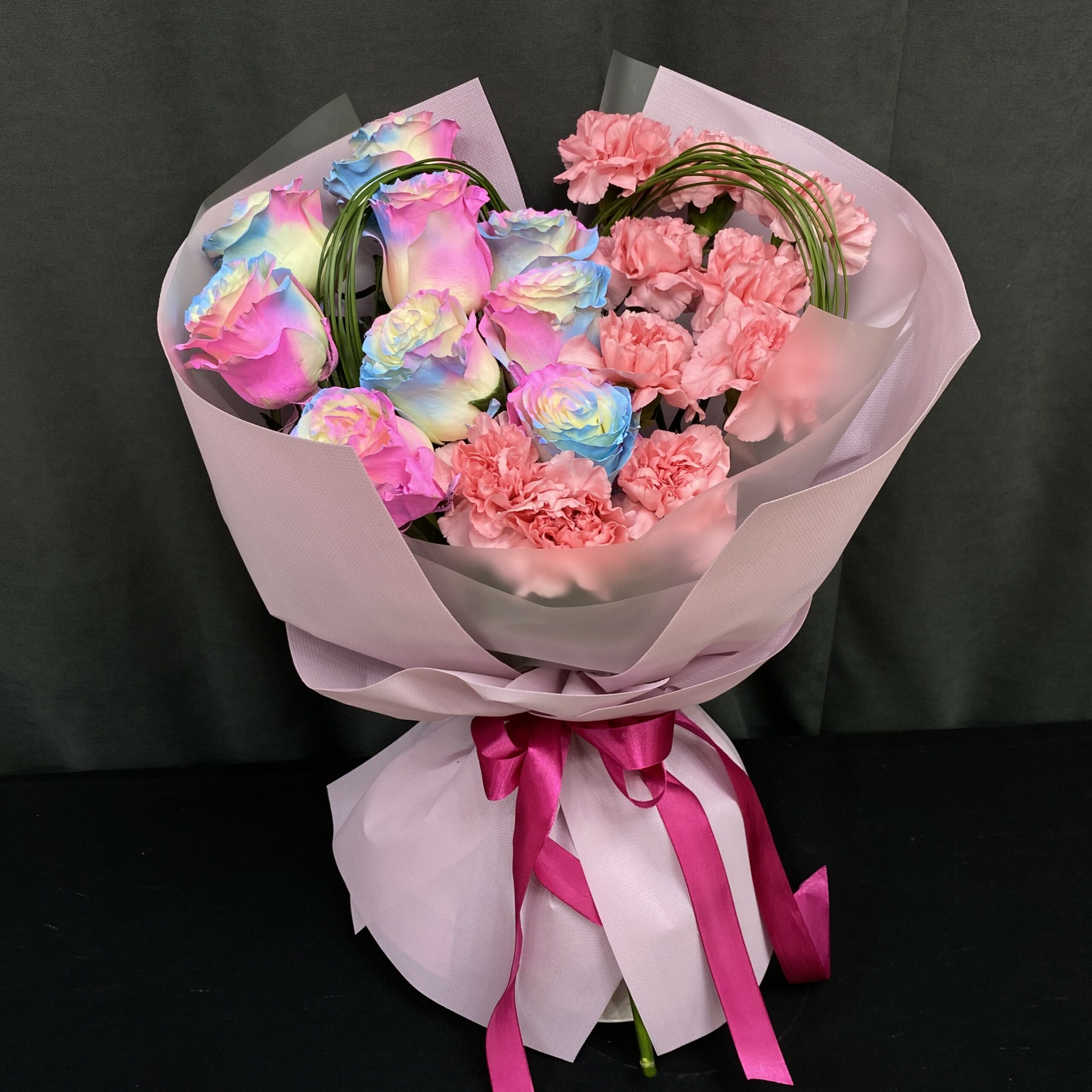 - Яркие цвета: Радужная роза с её многоцветными лепестками привносит в букет атмосферу радости и веселья, а розовый диантус добавляет нежности и утонченности.