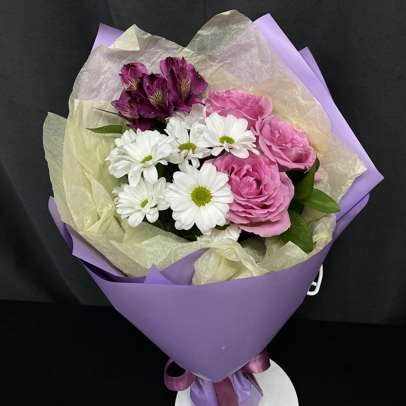 Состав: Рускус, Альстромерия фиолетовая – 1 шт, Роза розовая (Кения) 50см – 1 шт, Хризантема кустовая белая – 1 шт, Лента (атласная), Упаковка (дизайнерская пленка).