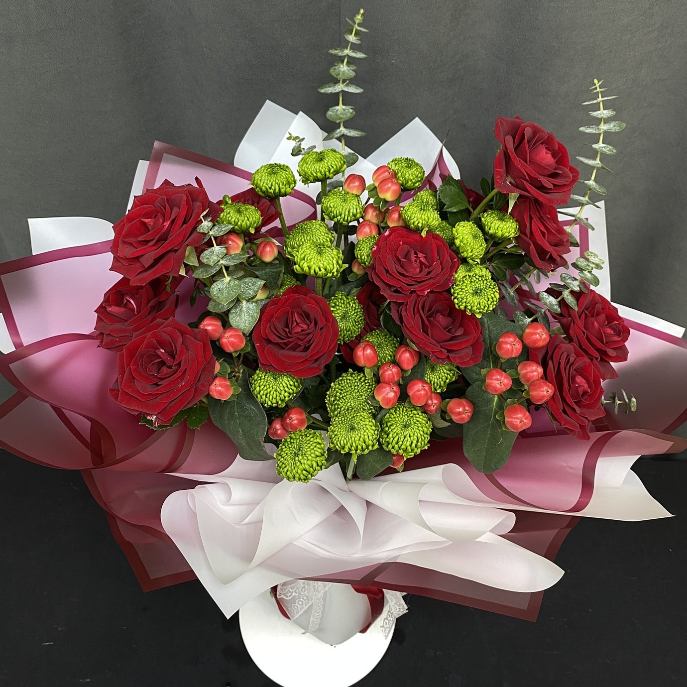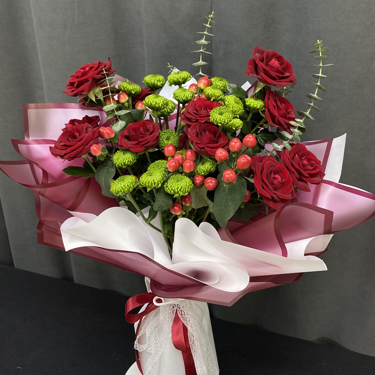 Состав: Кустовая роза красная – 3 шт, Хризантема кустовая зеленая – 3 шт, Гиперикум красный, Эвкалипт, Лента (атласная), Упаковка (дизайнерская пленка).