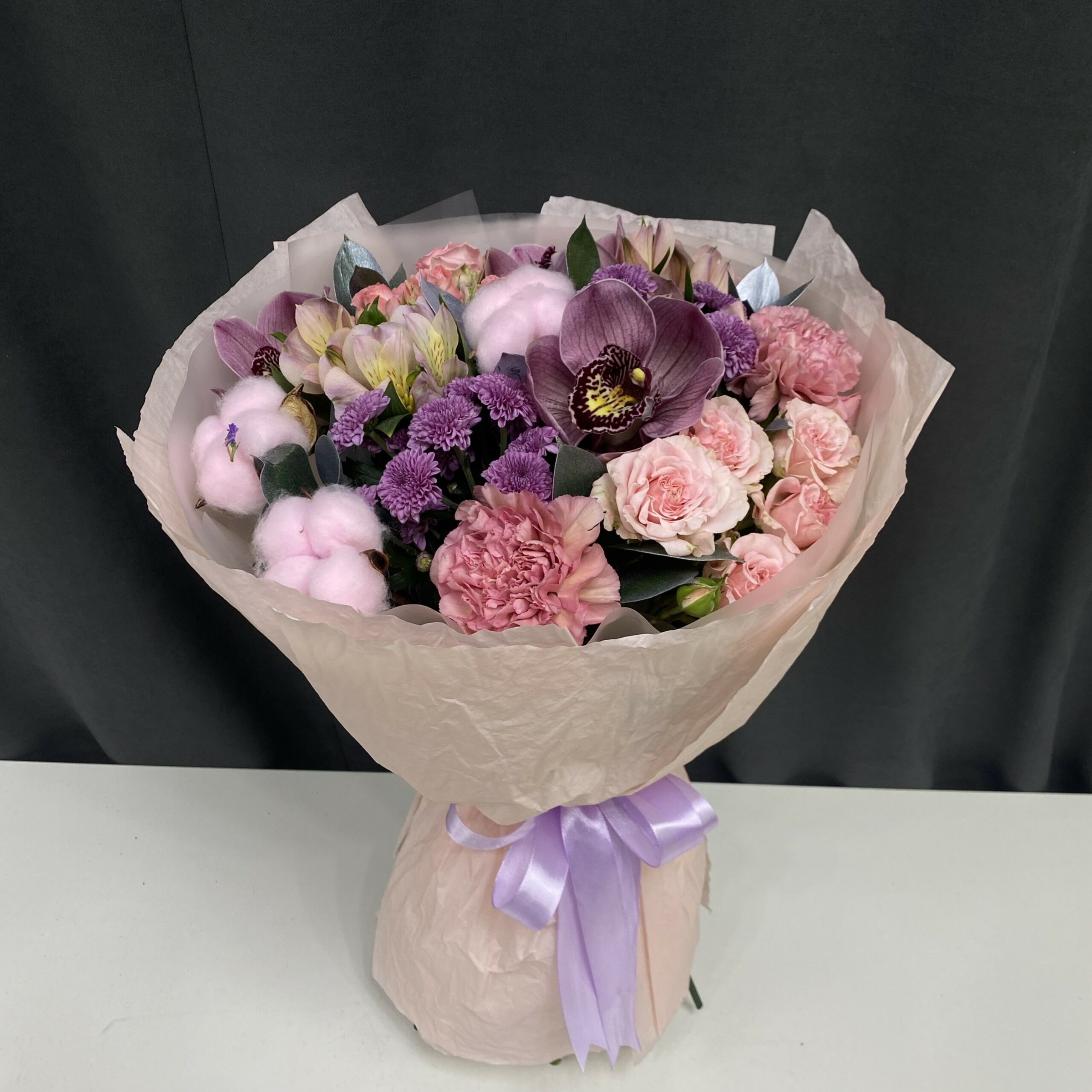 Состав: Рускус, Альстромерия розовая – 2 шт, Диантус розовый – 2 шт, Кустовая роза розовая пионовидная – 2 шт, Орхидея розовая – 3 шт, Хризантема кустовая разноцветная – 2 шт, Лента (атласная), Упаковка (дизайнерская пленка), Хлопок.