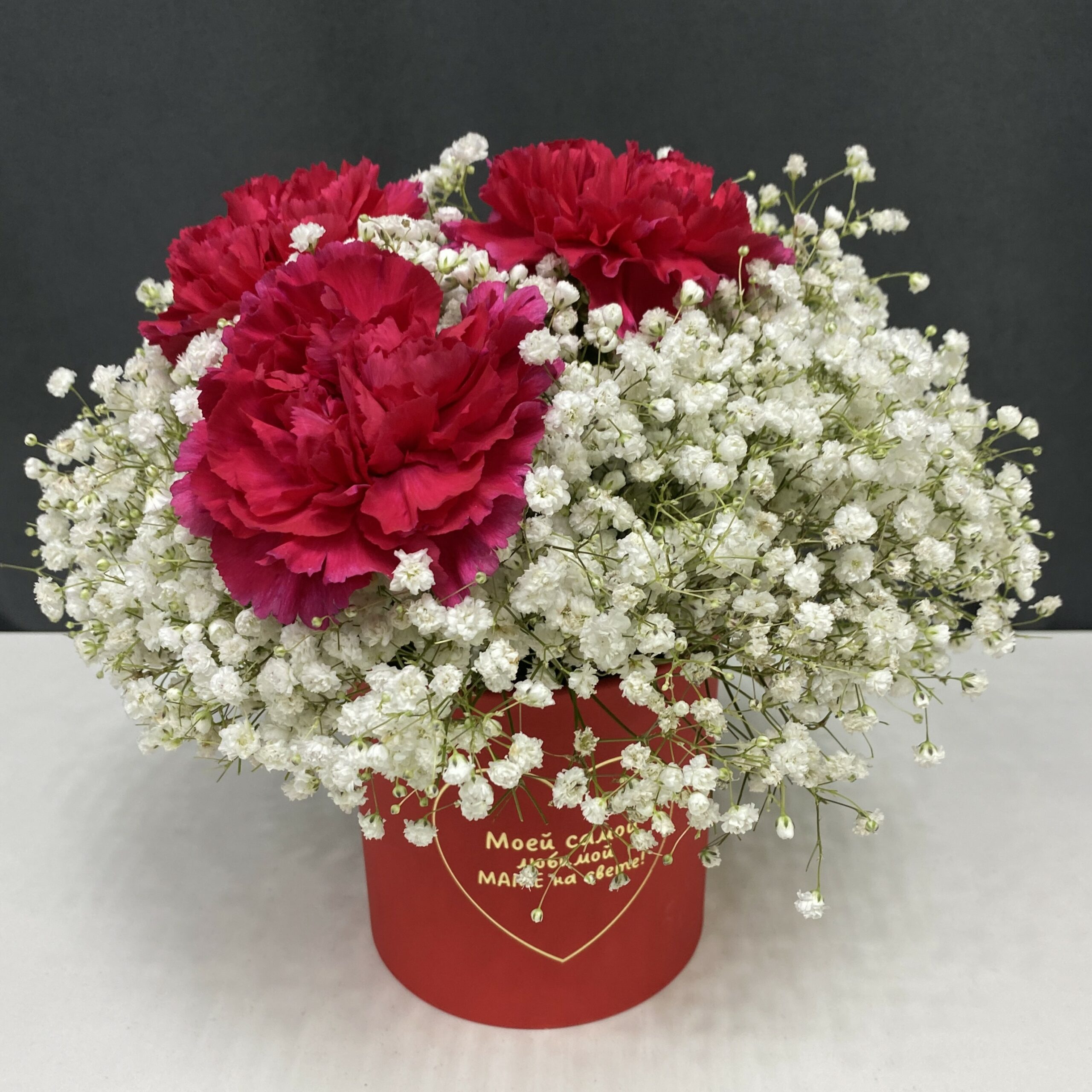 Эта композиция в элегантной коробке – воплощение воздушности и романтичного настроения для тех, кто ценит гармонию простых форм. Сочетание насыщенных малиновых гвоздик и невесомой гипсофилы создает трогательную композицию, где яркие акценты гармонично растворяются в воздушной белизне, даря ощущение лёгкости и вдохновения.