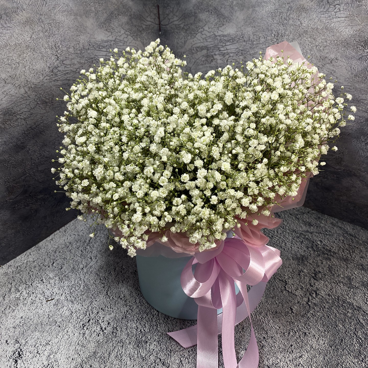 Монокомпозиция из гипсофилы одного оттенка представляет собой букет, где множественные мелкие соцветия на тонких ветвистых стеблях формируют воздушный, облачный объем без использования дополнительных растений. Белый цвет и легкая фактура делают такой букет визуально невесомым и универсальным. Подобные сборки выбирают для ситуаций, предполагающих нейтральную, светлую подачу.