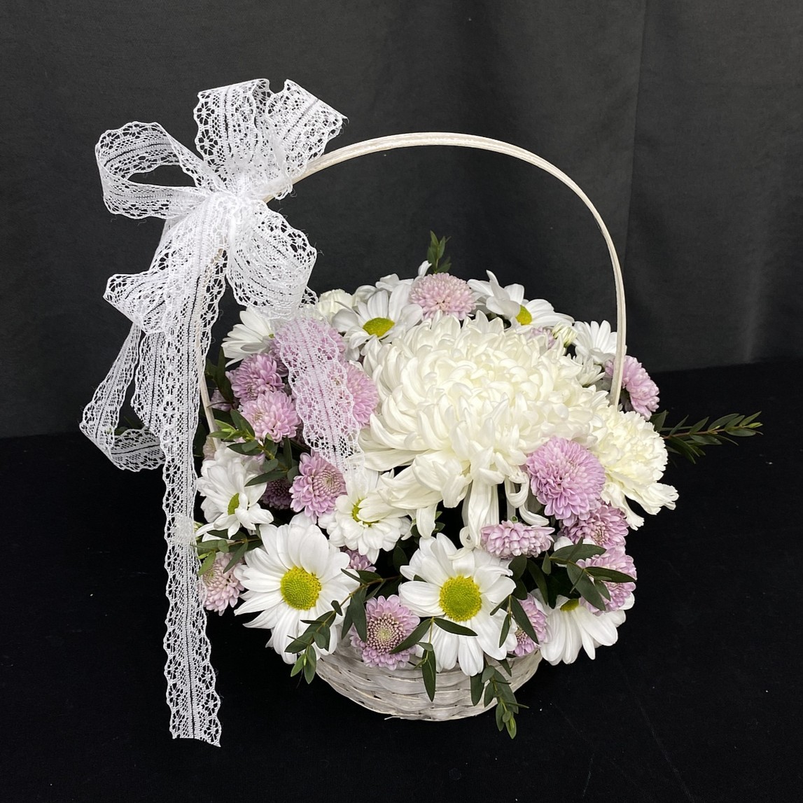 Состав: Диантус белый – 2 шт, Хризантема кустовая белая – 2 шт, Хризантема сантини – 5 шт, Хризантема одноголовая белая – 1 шт, Эвкалипт, Лента (атласная), Упаковка (дизайнерская пленка), Оазис, Корзина.