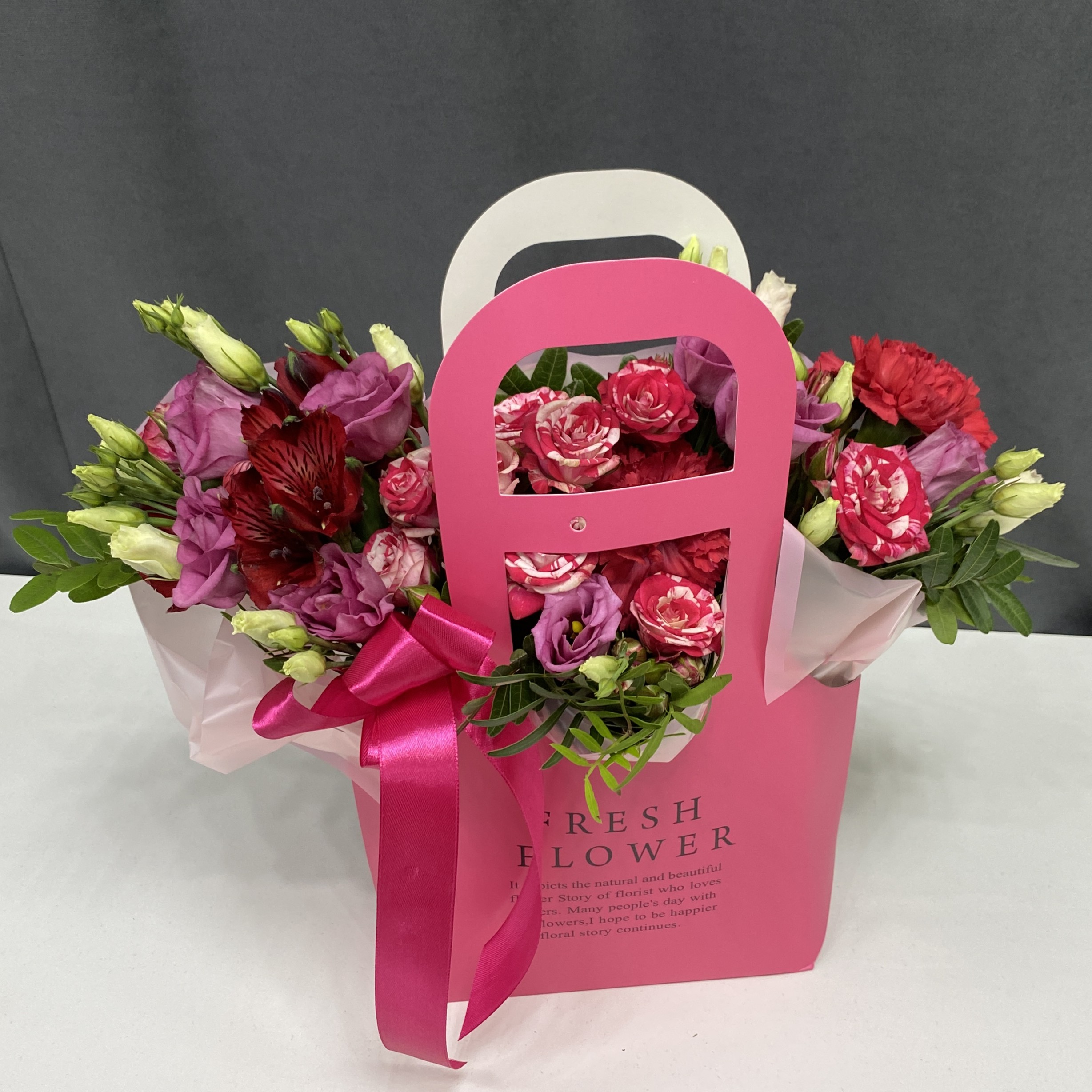 Эта композиция в стильной сумке-кашпо – идеальное сочетание энергии и утонченности для тех, кто ценит яркие эмоции и глубокий символизм. Сочетание насыщенных красных гвоздик, благородных роз Фарерворкс, нежных эустом и ажурной фисташки создает многоуровневую композицию, где страстные красные тона гармонично переплетаются с нежно-розовыми акцентами, даря ощущение тепла и вдохновения.