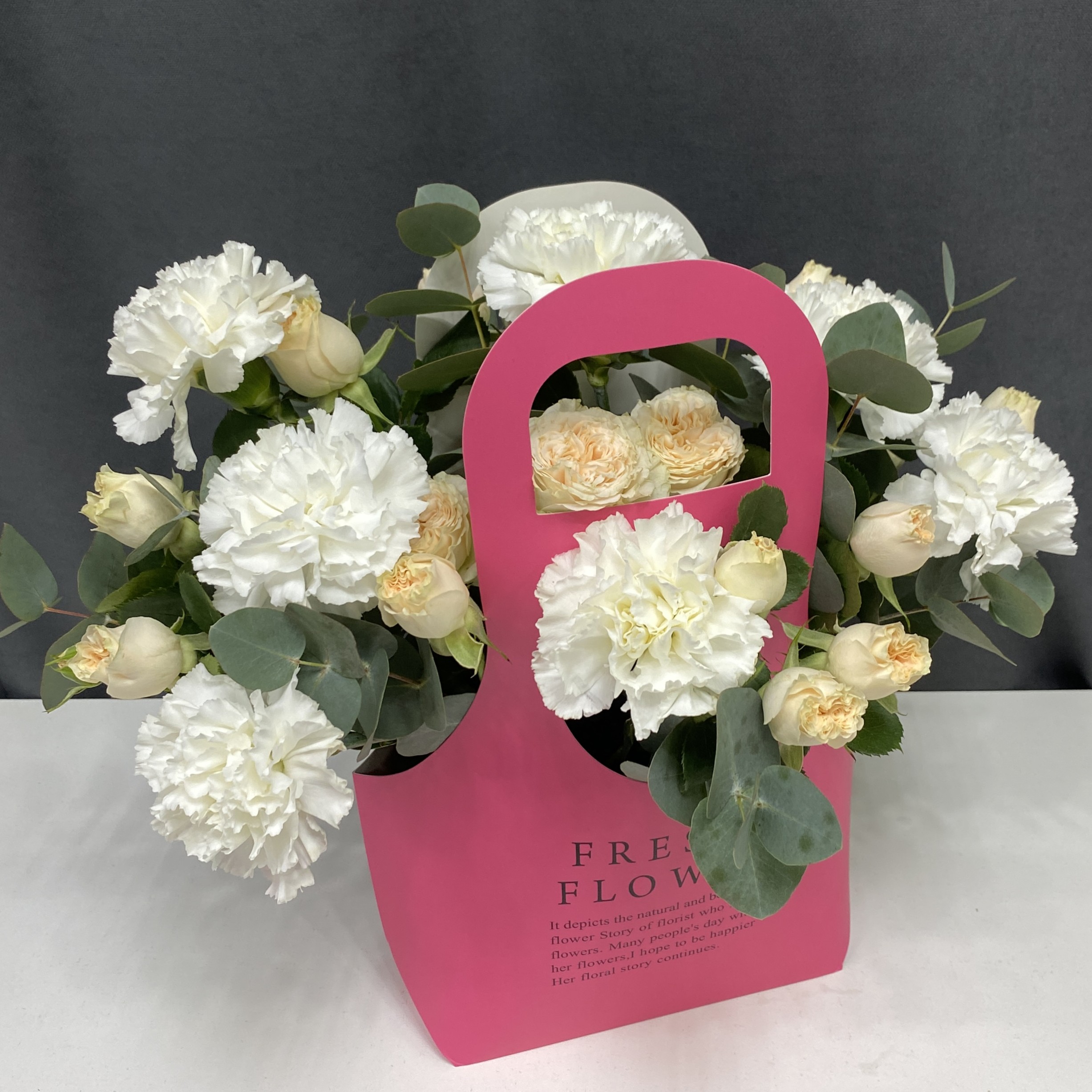 Эта композиция в стильной сумке-кашпо – воплощение чистоты и утонченного вкуса для тех, кто ценит гармонию и лаконичность. Сочетание белоснежных гвоздик, нежных роз Саммерроуз и ажурного эвкалипта создает воздушную и элегантную композицию, где кристальная белизна гармонично переплетается с серебристой зеленью, даря ощущение свежести и безмятежности.
