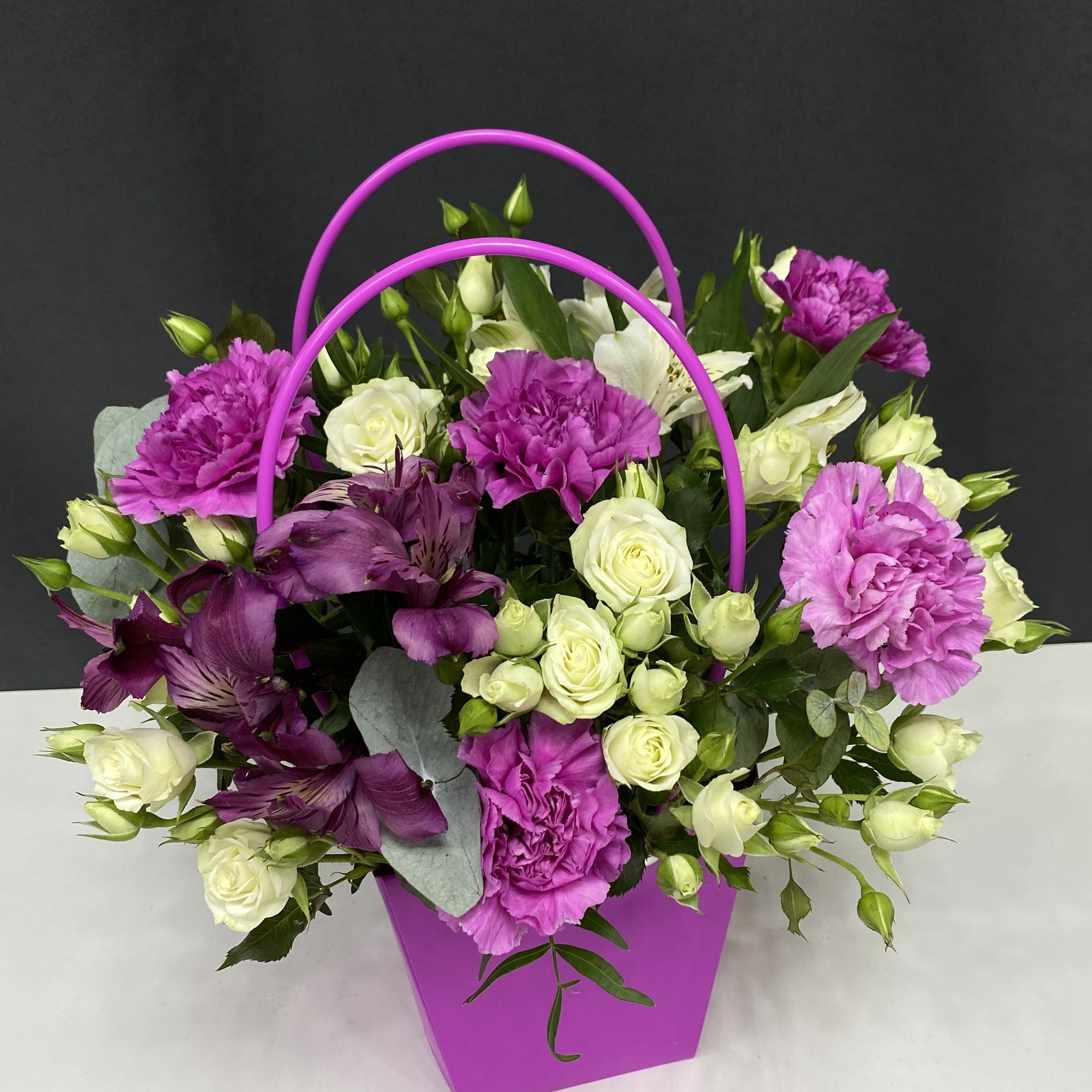 Эта композиция в стильной сумке-кашпо – воплощение таинственности и утонченной элегантности для тех, кто ценит глубину и многогранность. Сочетание изысканных гвоздик Фарида, нежных альстромерий и экзотических роз Грин Глоу создает сложную многоуровневую композицию, где фиолетовые тона гармонично переплетаются с белыми акцентами и серебристой зеленью, даря ощущение загадочности и спокойствия.