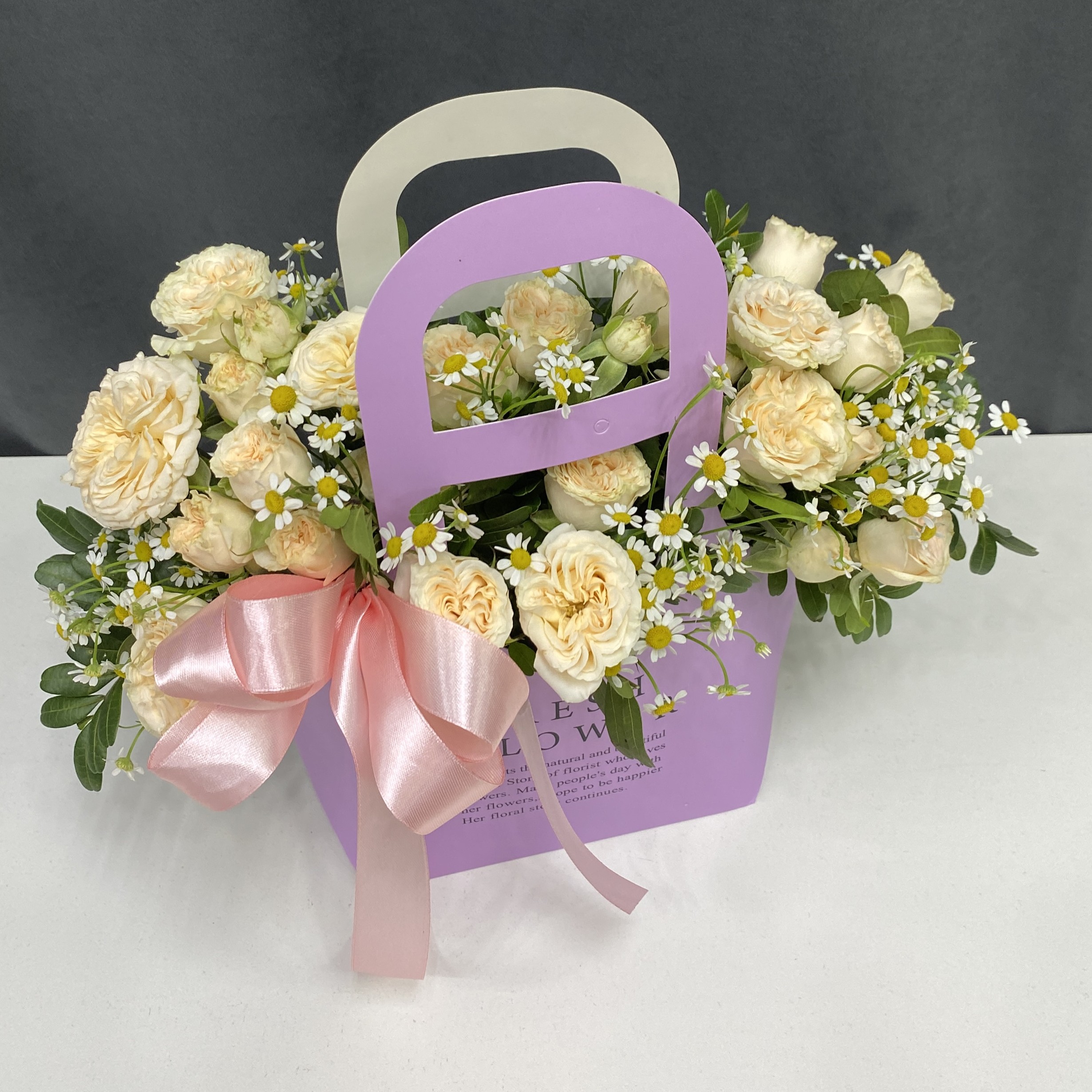 • Уникальность – нежные розы Саммер Роуз, кружевной танацетум и ажурная фисташка создают природную гармонию в современном формате сумки-кашпо